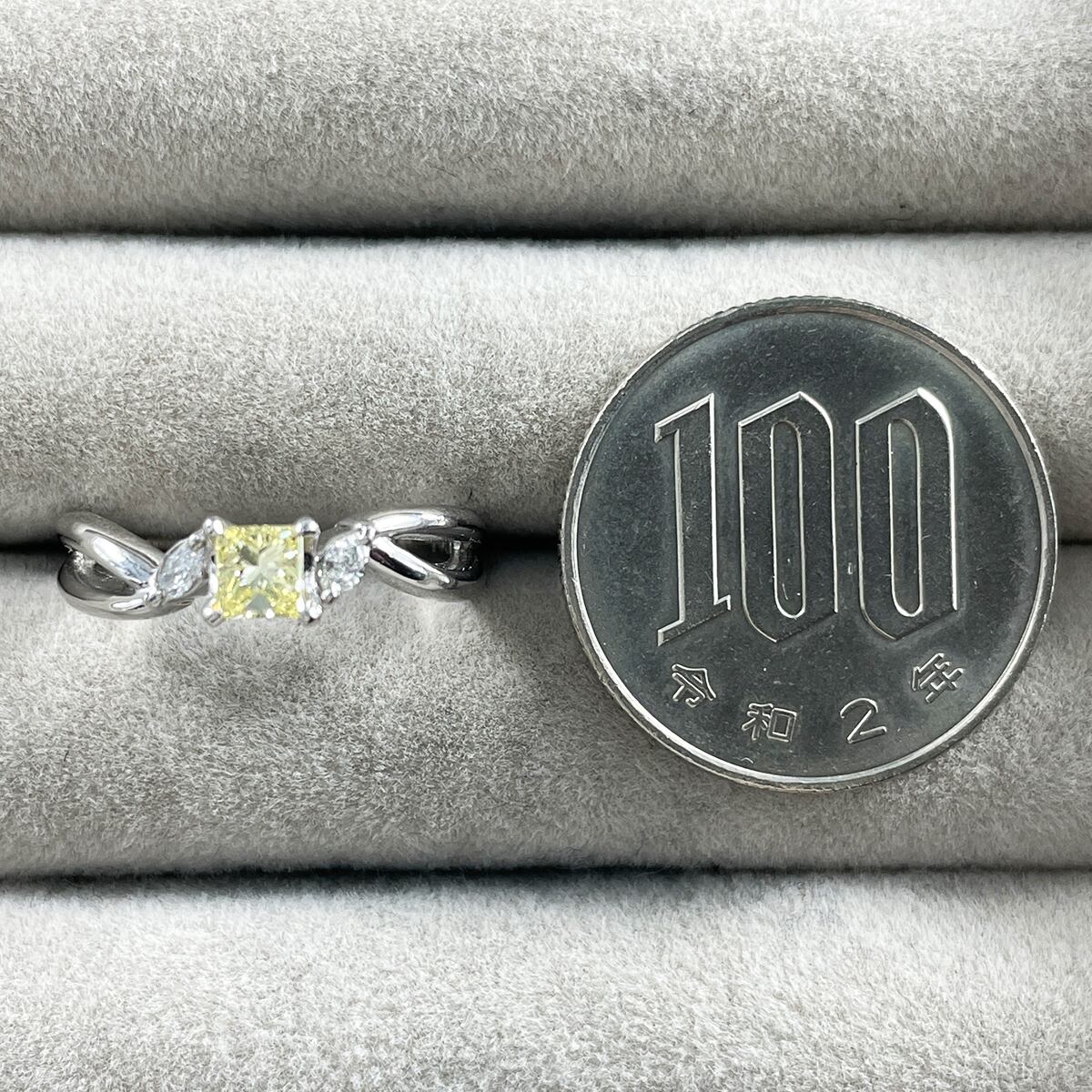 プリンセスカットのイエローダイヤモンドの輝きが美しいリング。