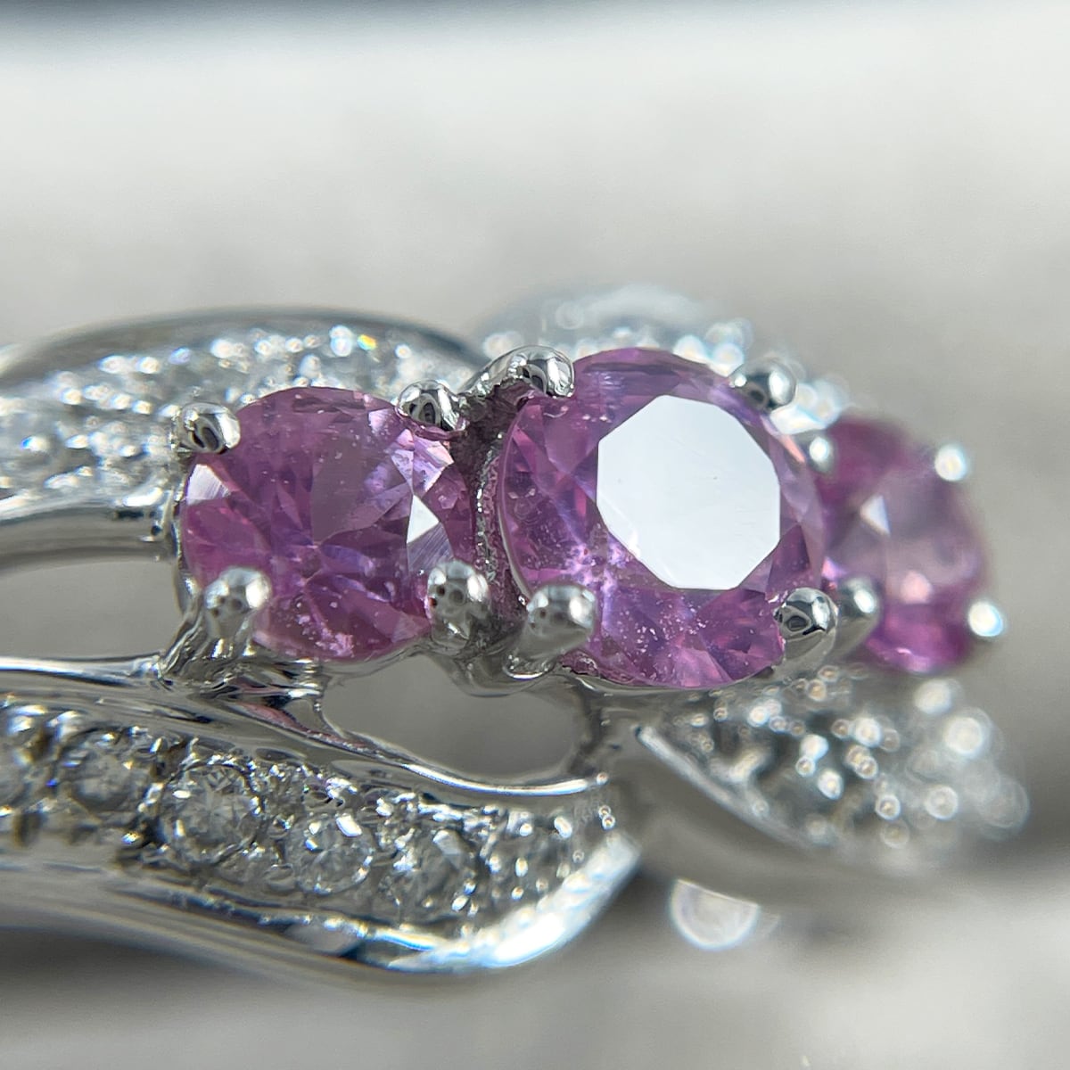 鮮やかな3粒のピンクサファイアが贅沢なデザインリング。