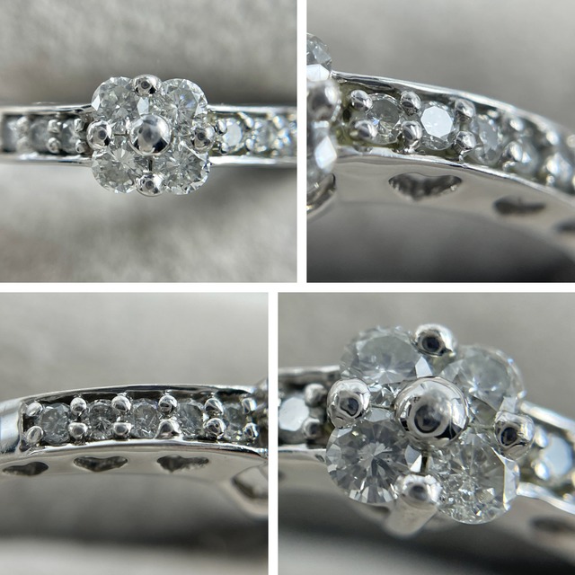 繊細にセッティングされたダイヤモンドが、中心の花のようなモチーフを引き立てるエレガントなリング。