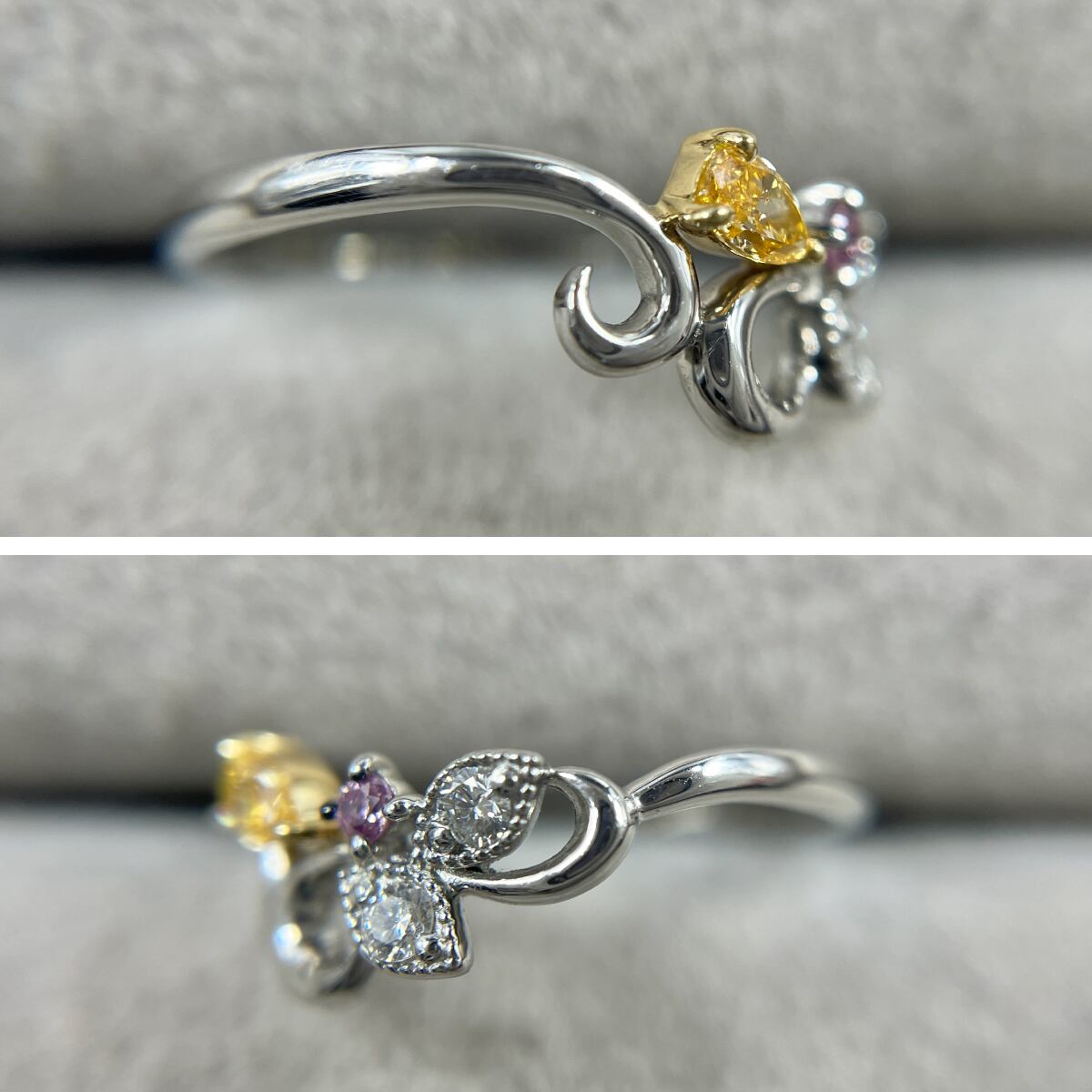 鮮やかなイエローとピンクのダイヤモンドが寄り添う可憐なリング。