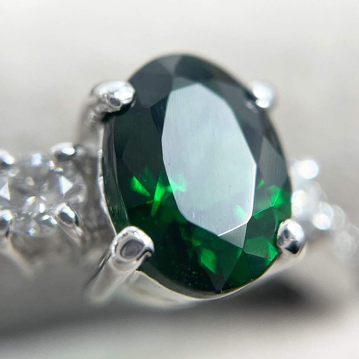 深みのある緑色が目を惹くグリーングロッシュラーガーネットのリング。