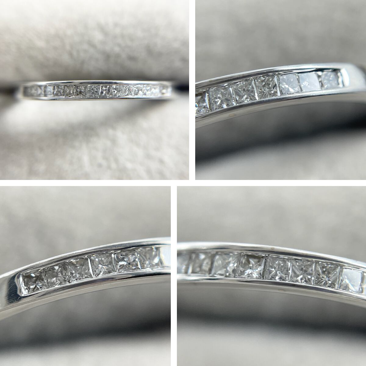 クールなホワイトゴールドに並んだプリンセスカットダイヤが、上品かつ華やかなハーフエタニティリング✨