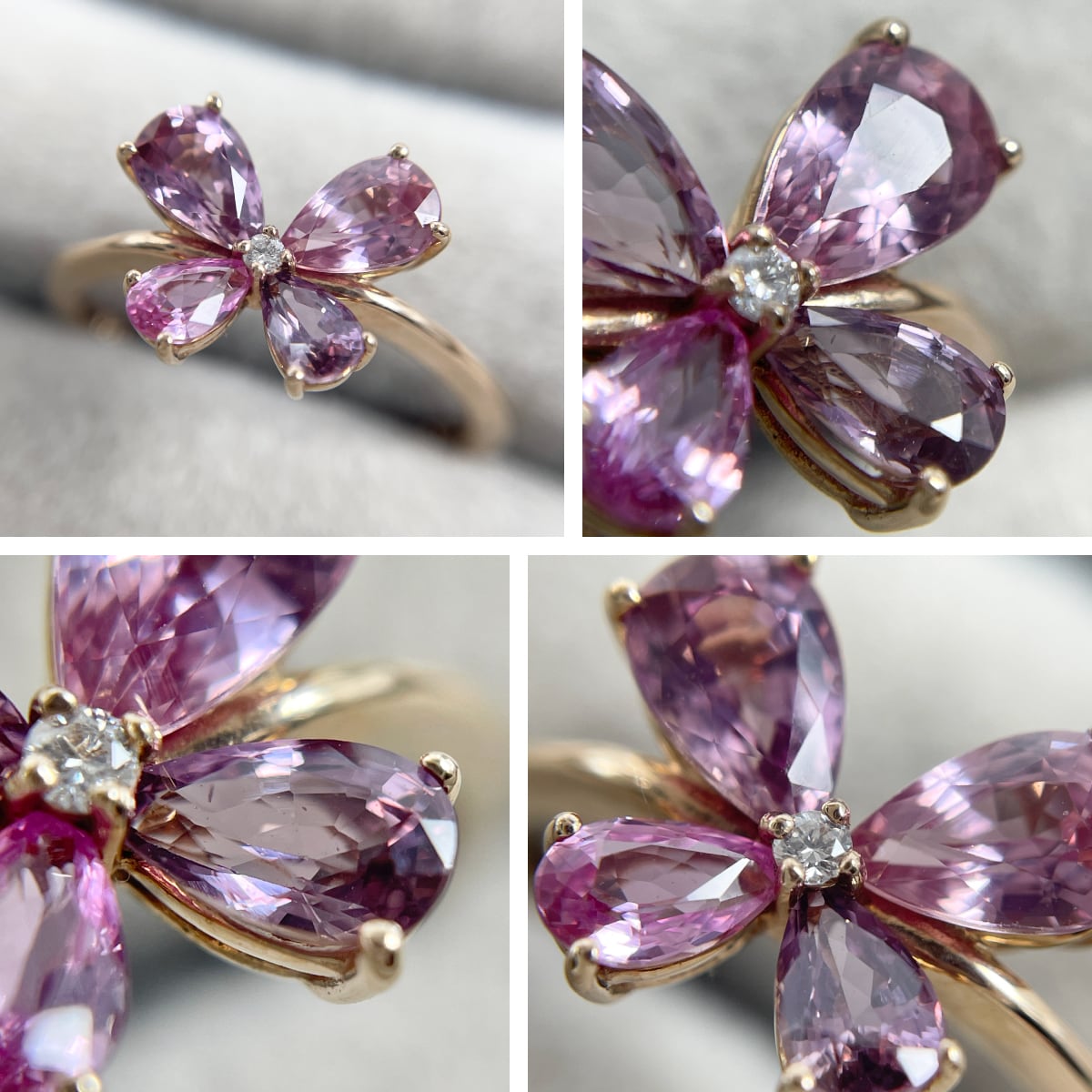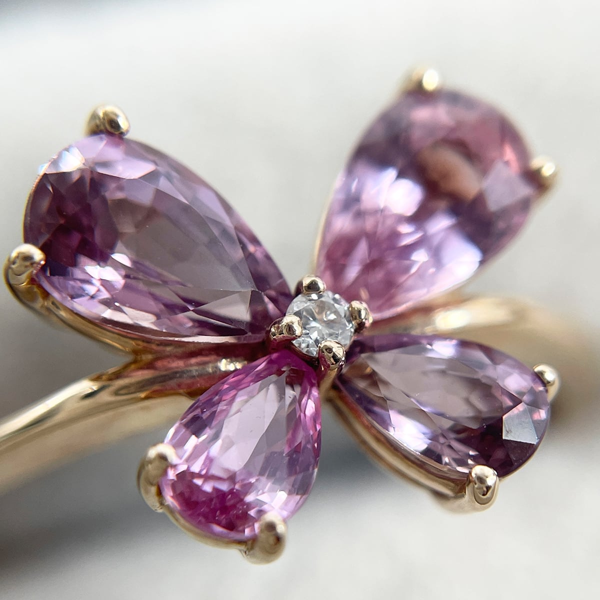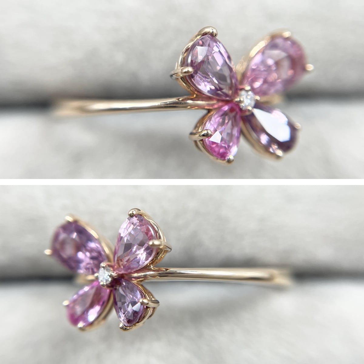 蝶のように並んだ非加熱ピンクサファイアが可憐にきらめくリング。