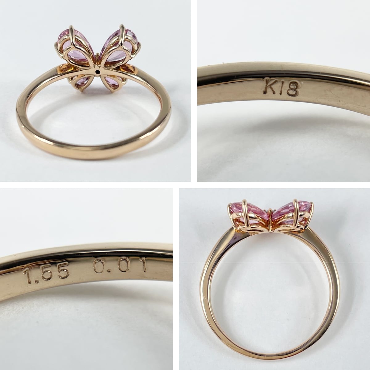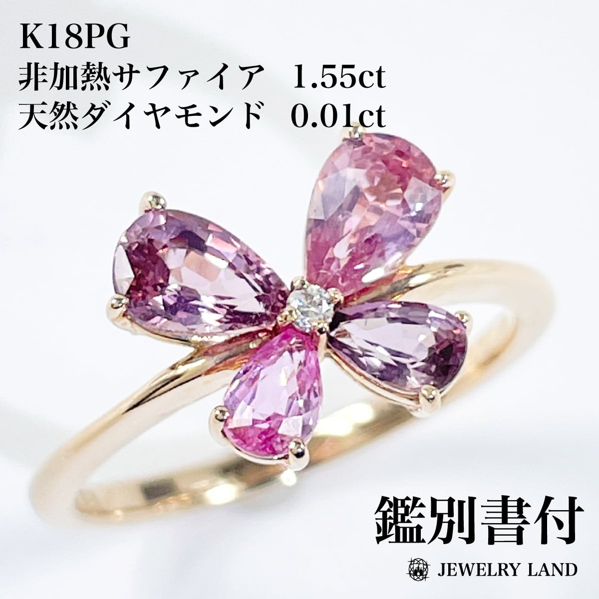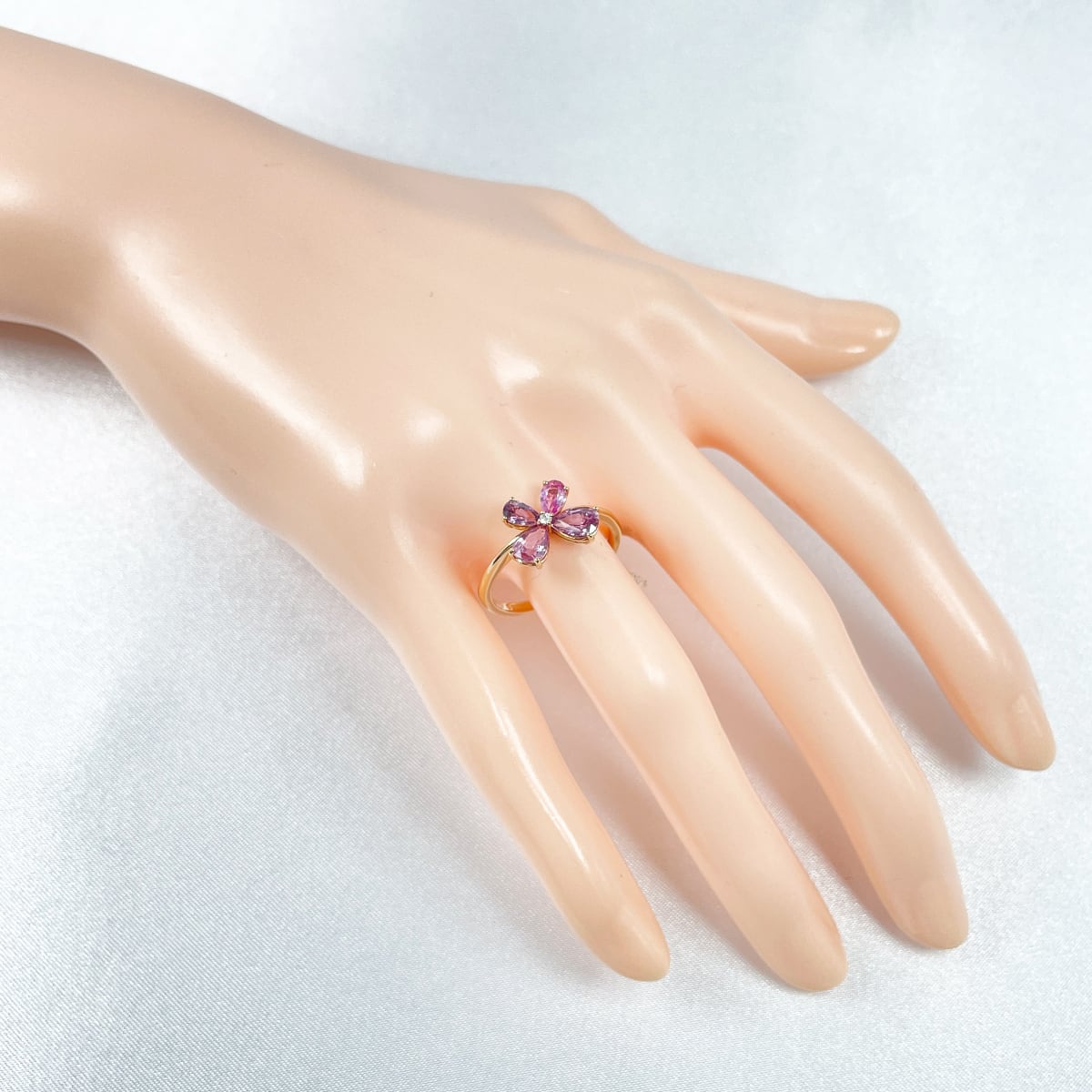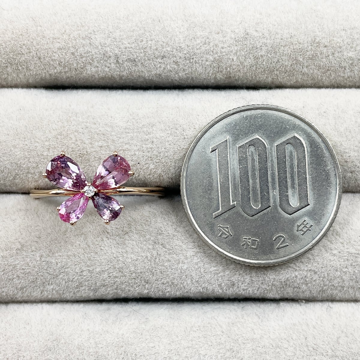 蝶のように並んだ非加熱ピンクサファイアが可憐にきらめくリング。