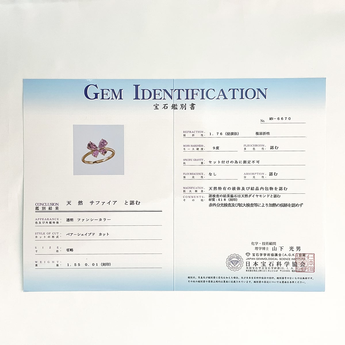 K18PG 非加熱サファイア 1.55ct ダイヤモンド 0.01ct リング