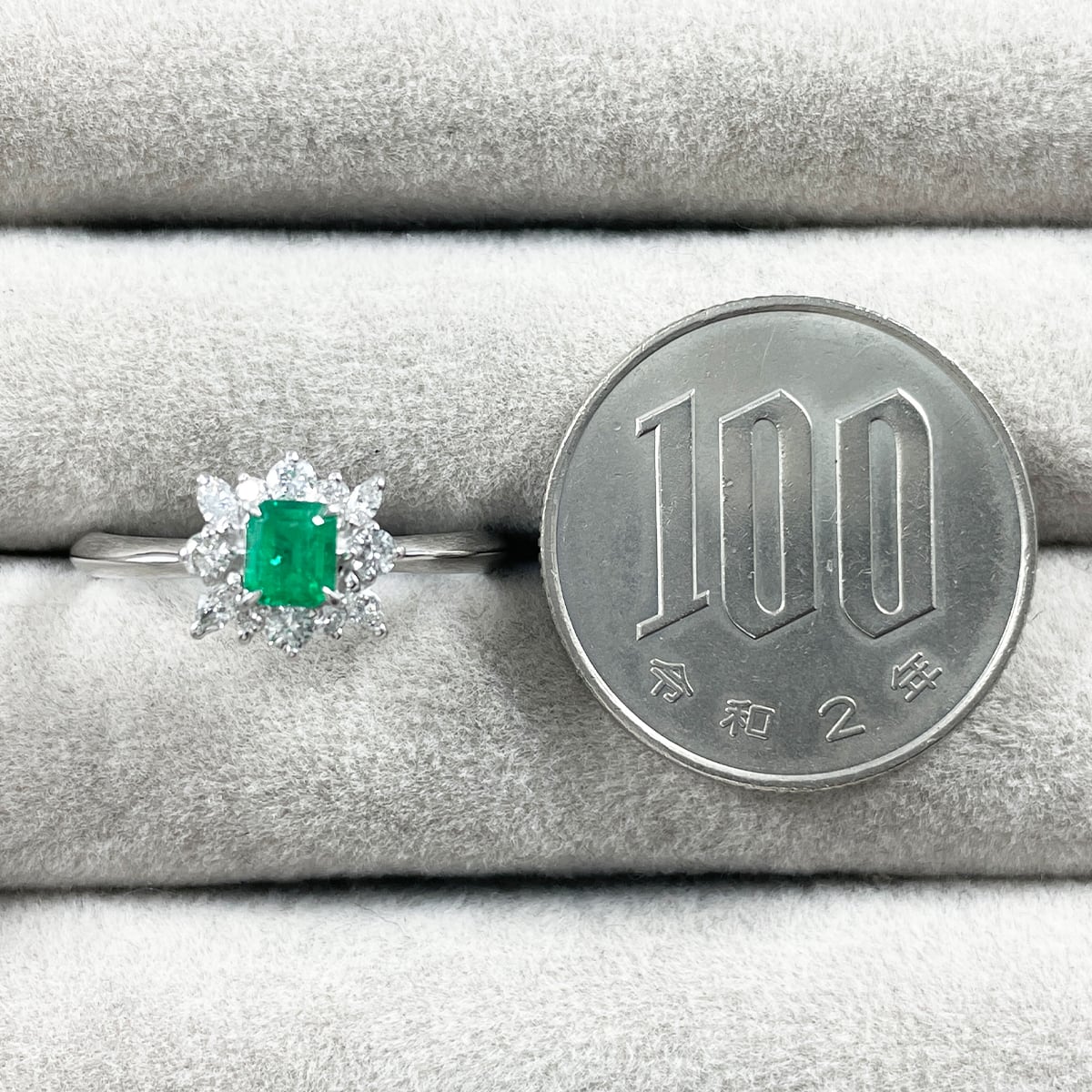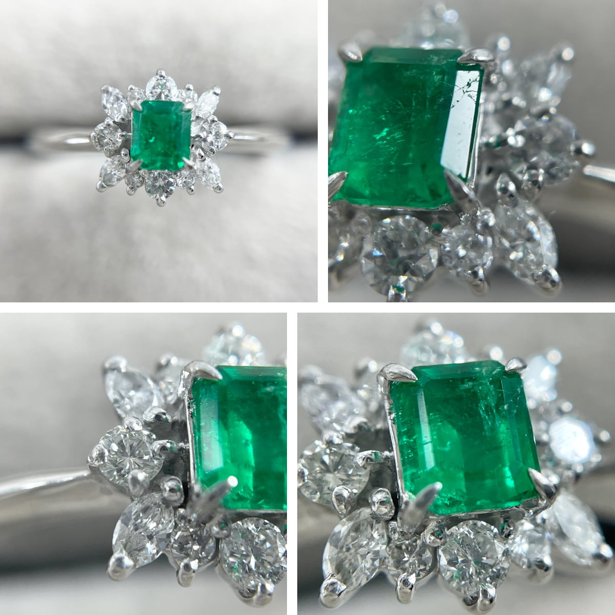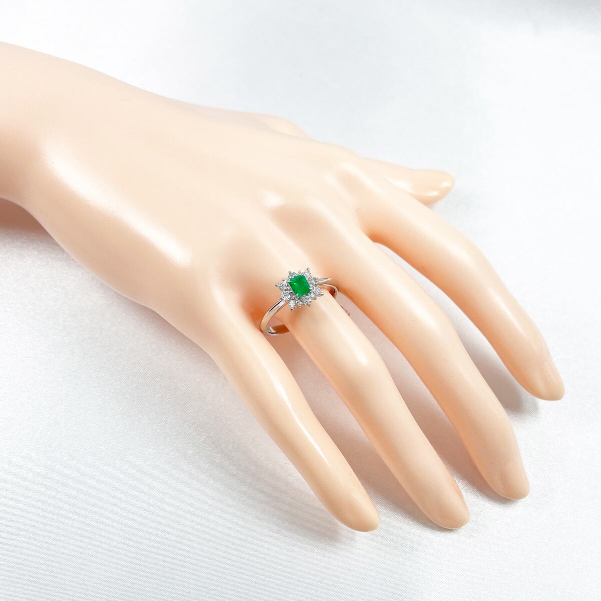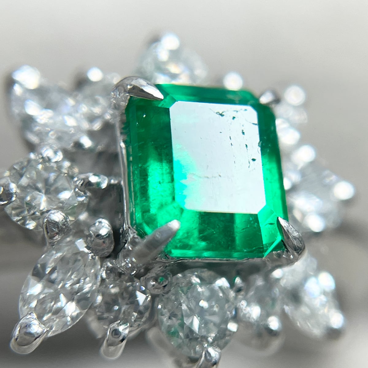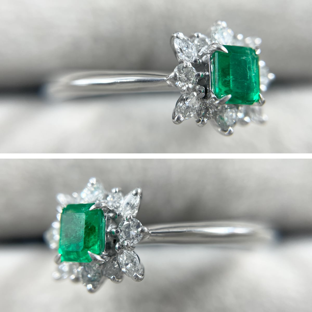 中央のエメラルドを囲むダイヤモンドが、まるで花が咲いたような華やかさ✨