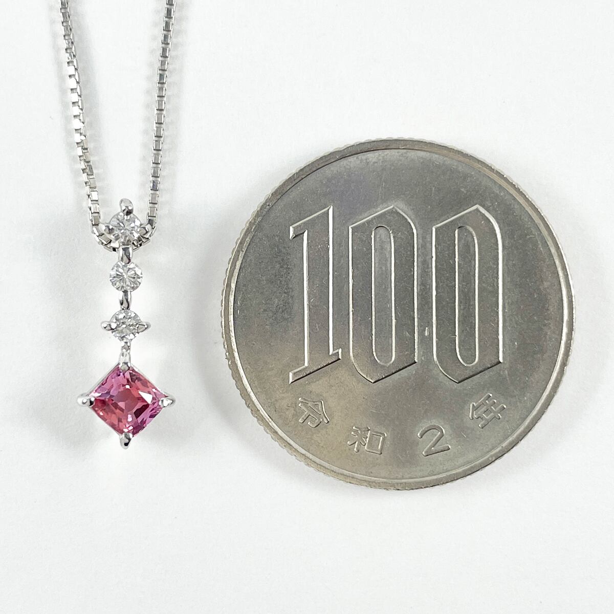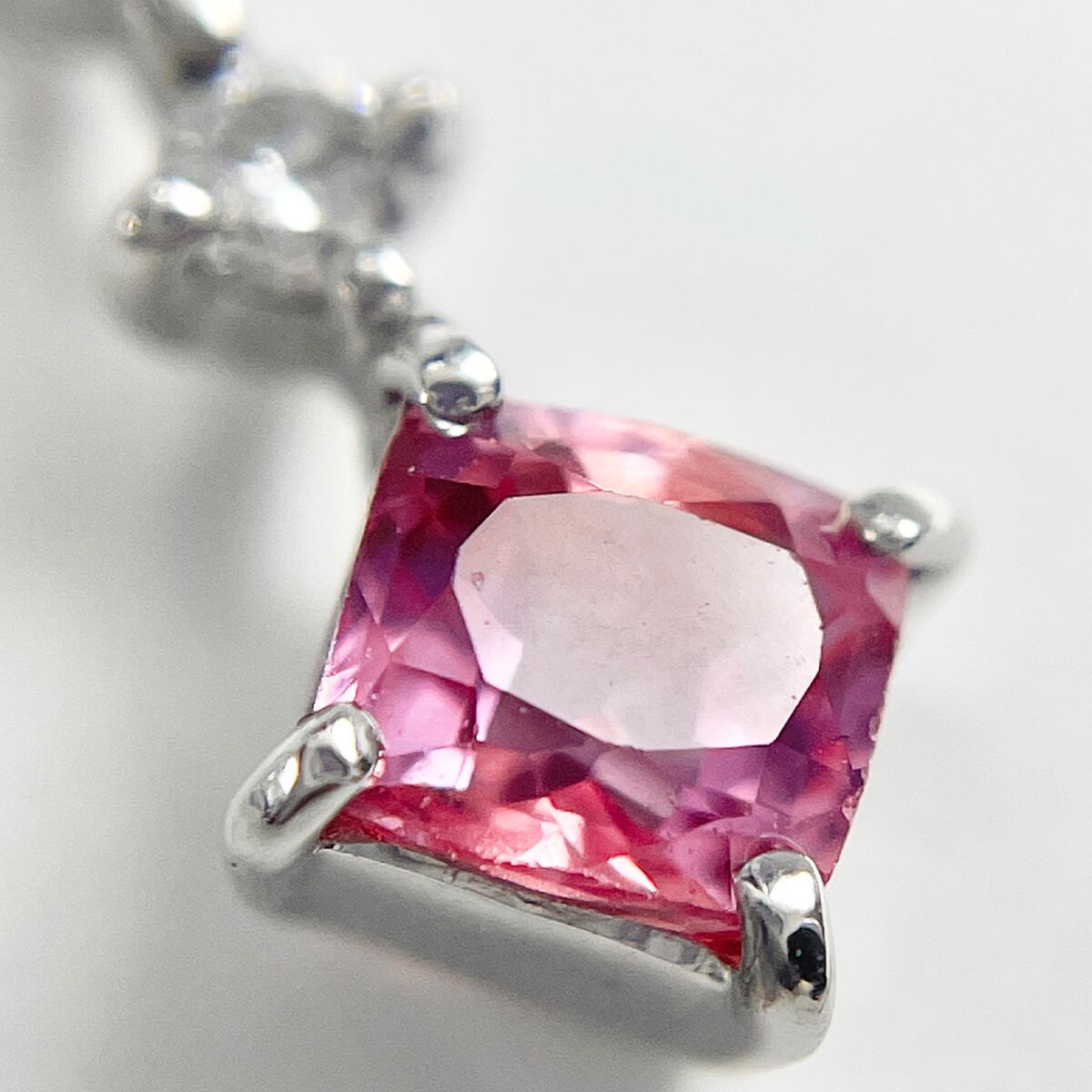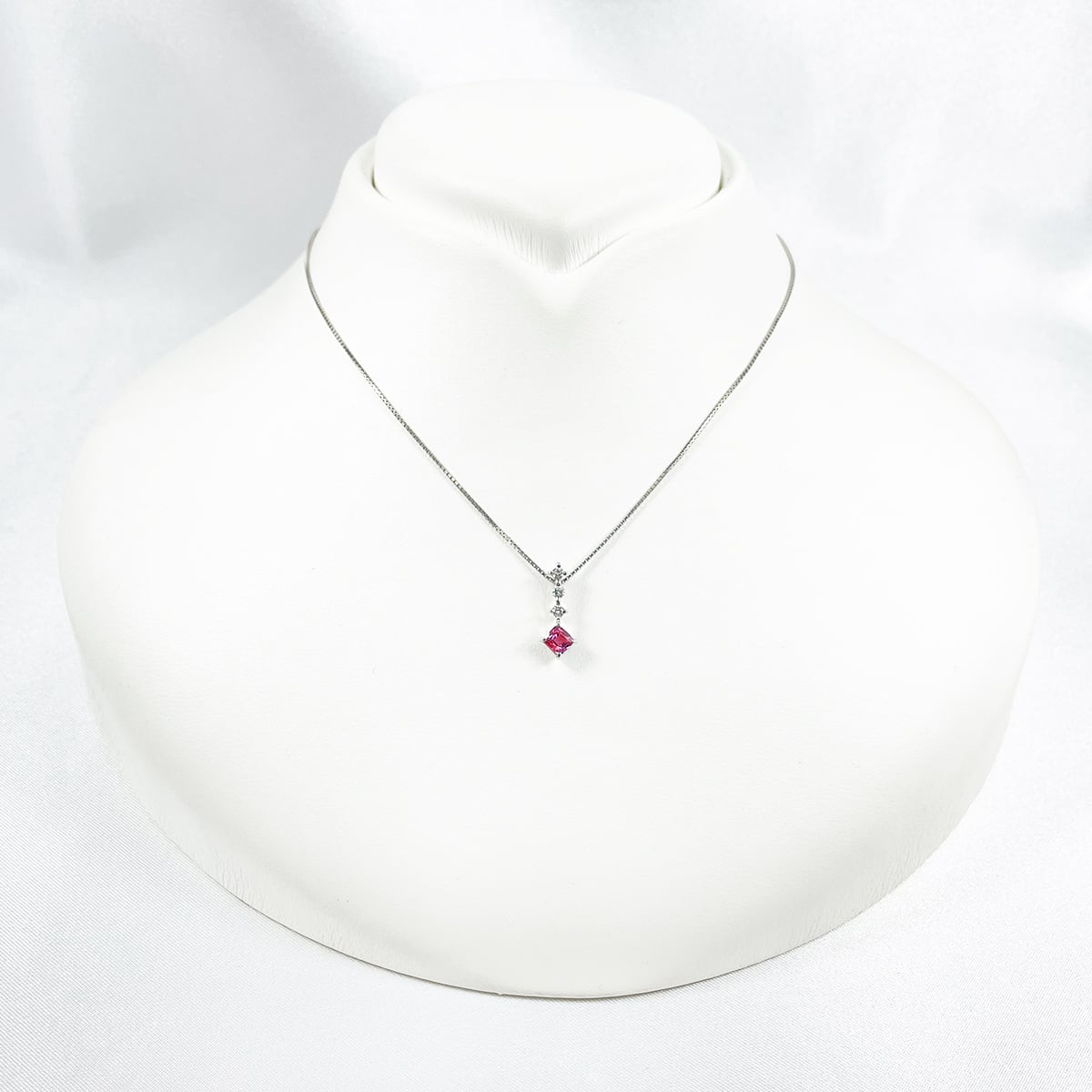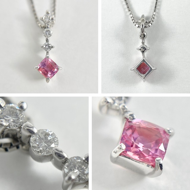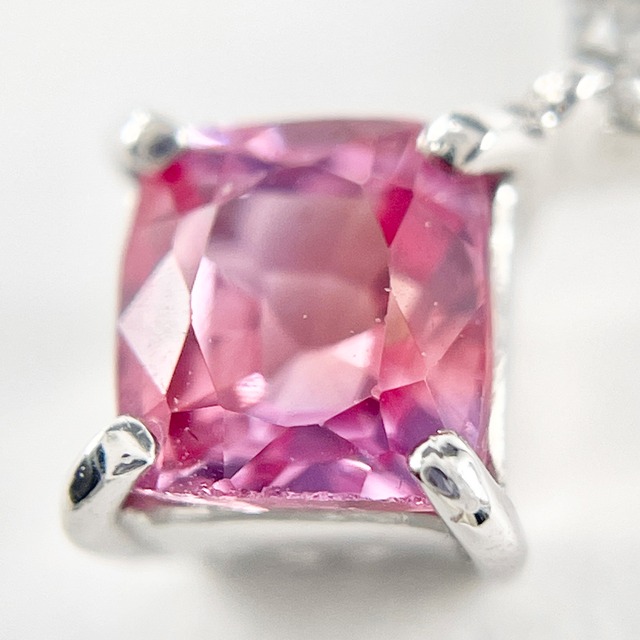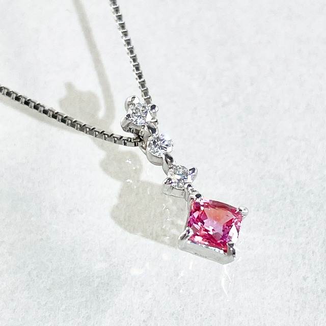 鮮やかなピンクサファイアを主役に、ダイヤモンドが華やぎを添えるネックレス。