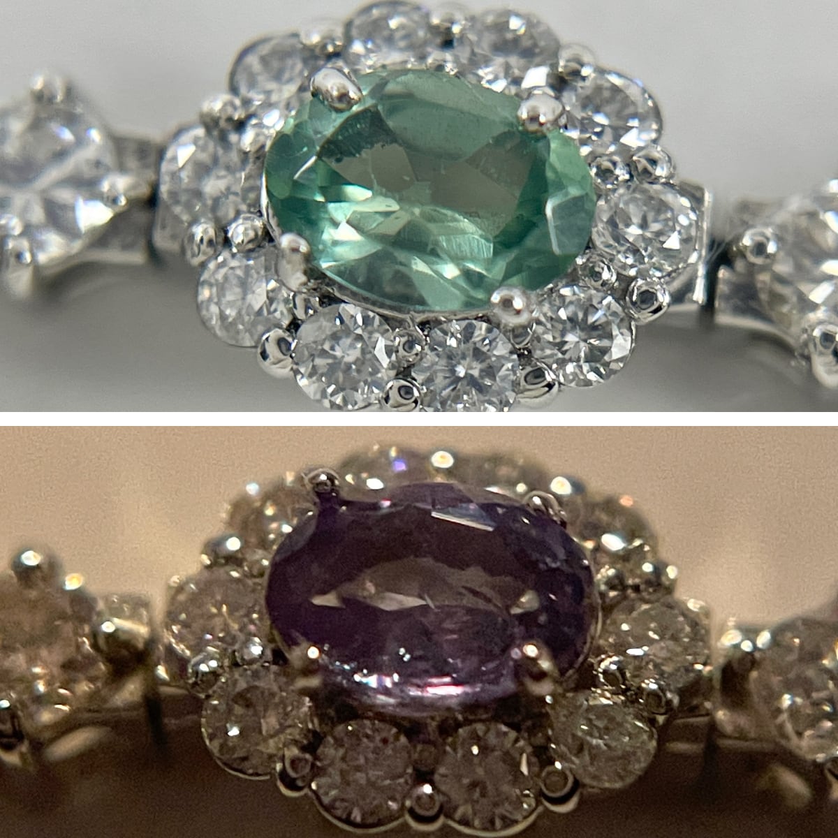 一石一石を囲むダイヤの輝きが、カラーチェンジの美しさをよりドラマチックに引き立てます♪