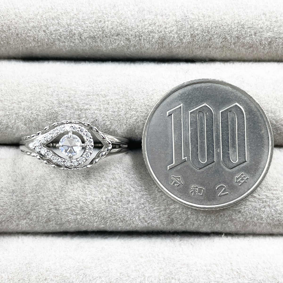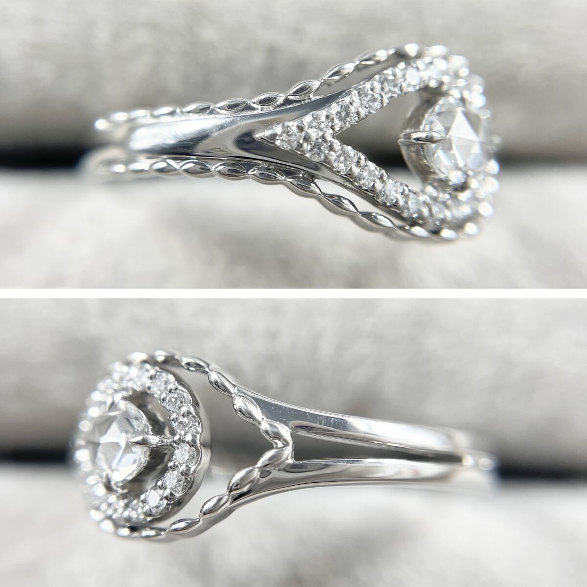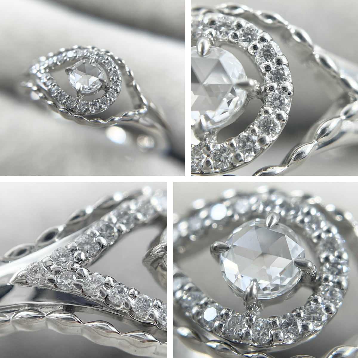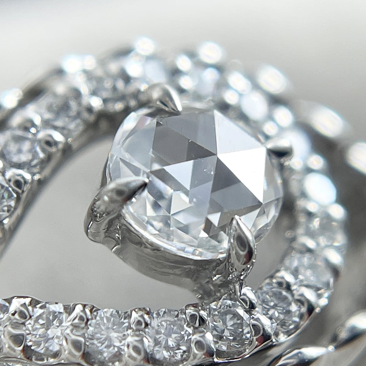 中央にローズカット、その周りをラウンドダイヤで囲んだ贅沢なデザインのリング。