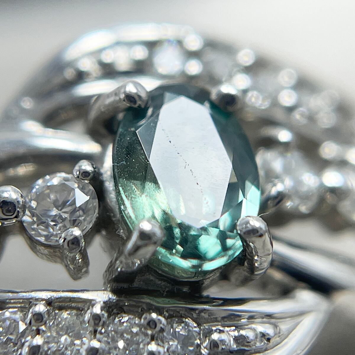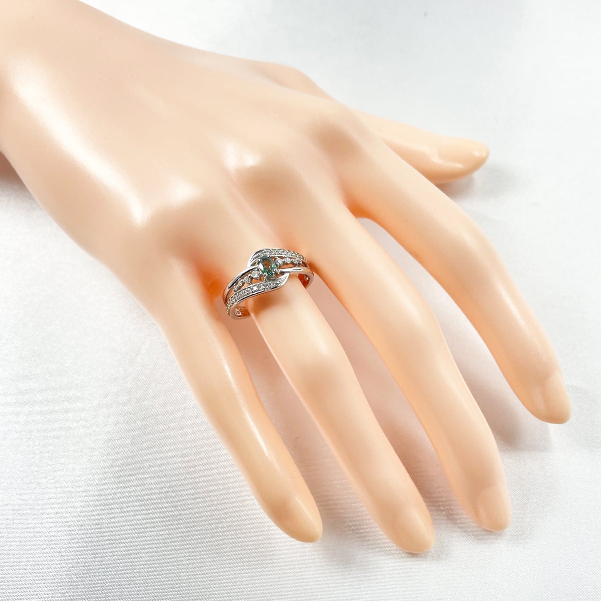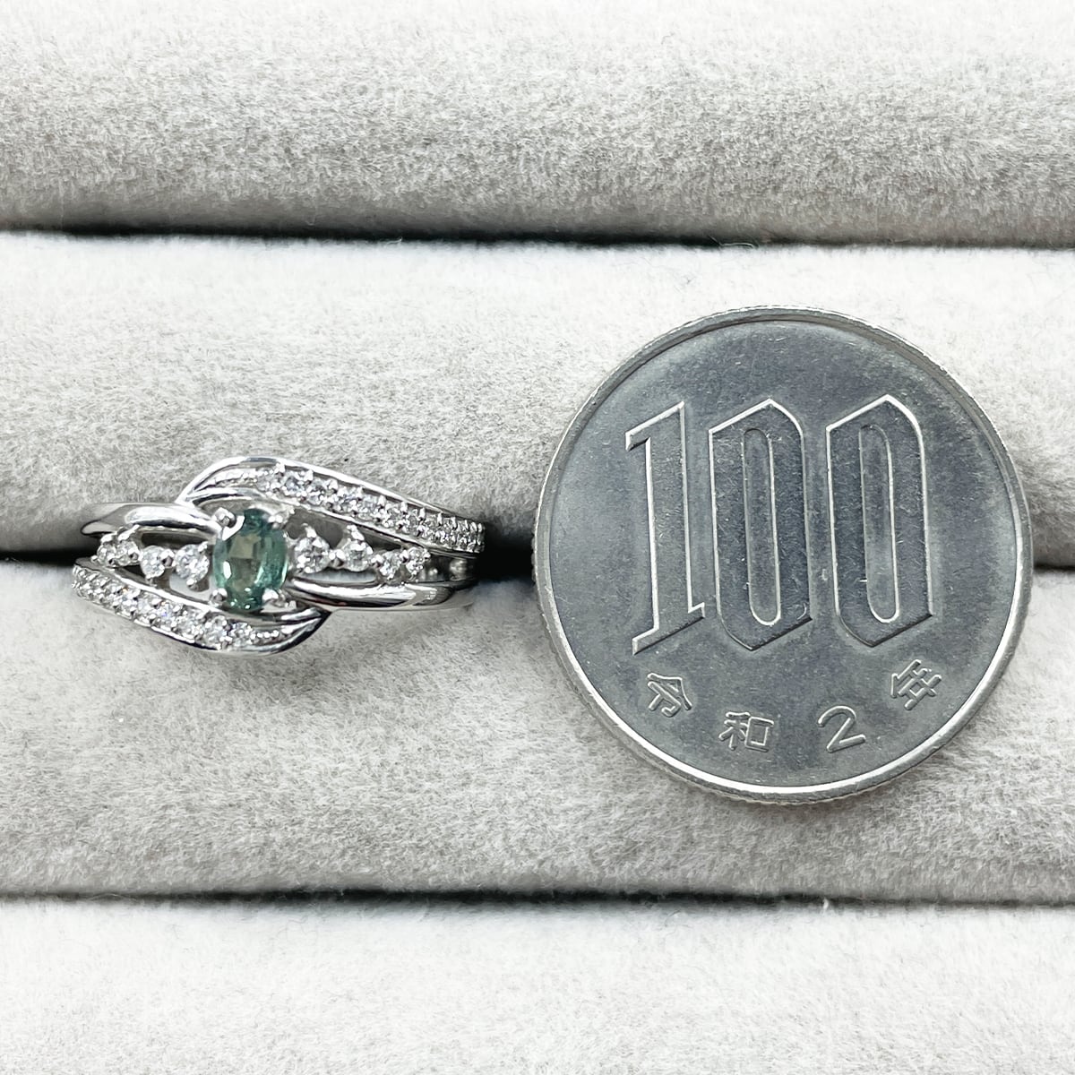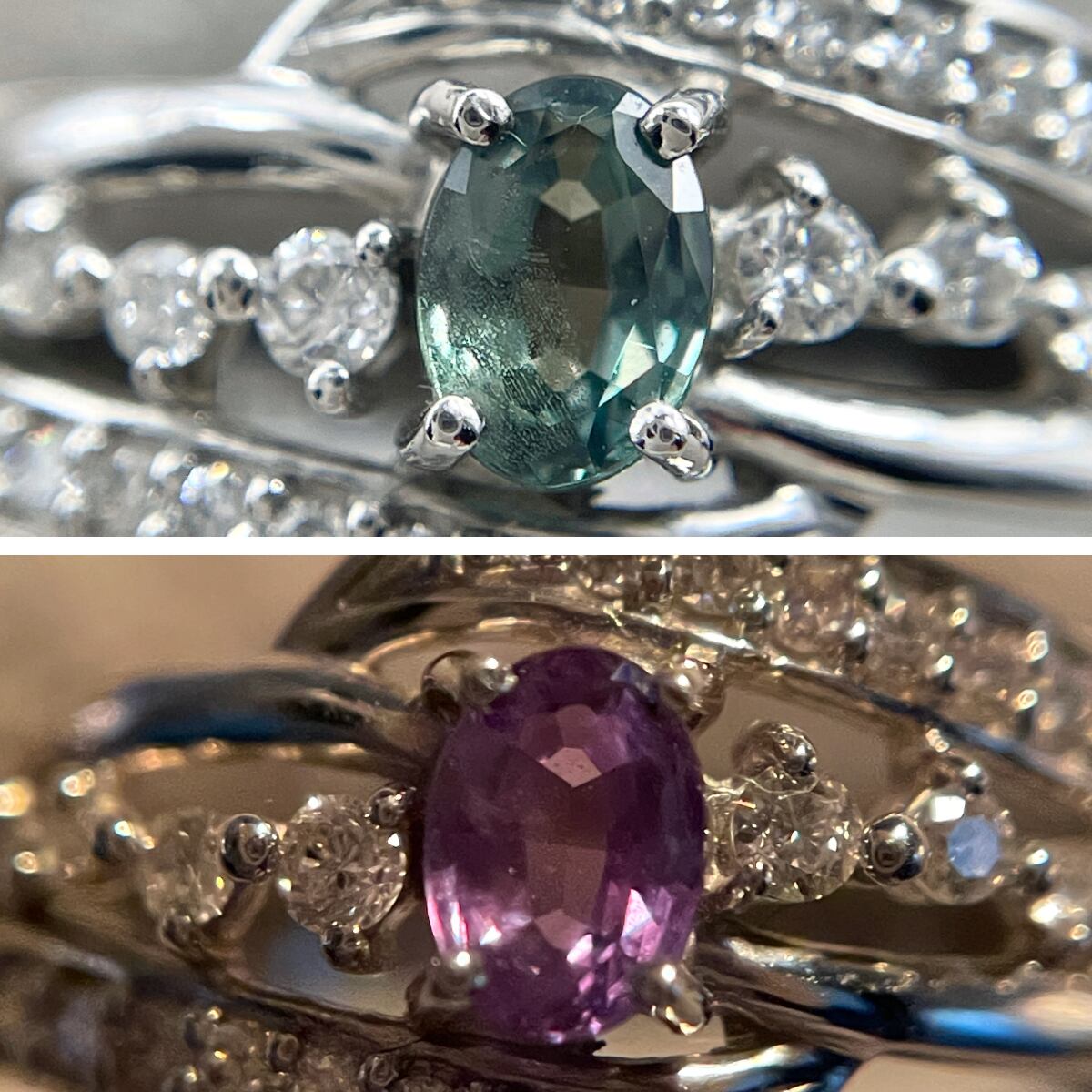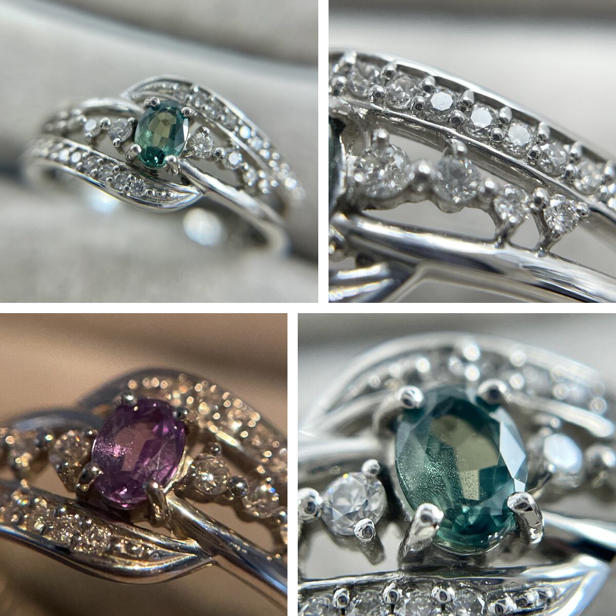 中央のアレキサンドライトに寄り添うように、サイドのダイヤが光のラインを描く優雅なデザイン♪
