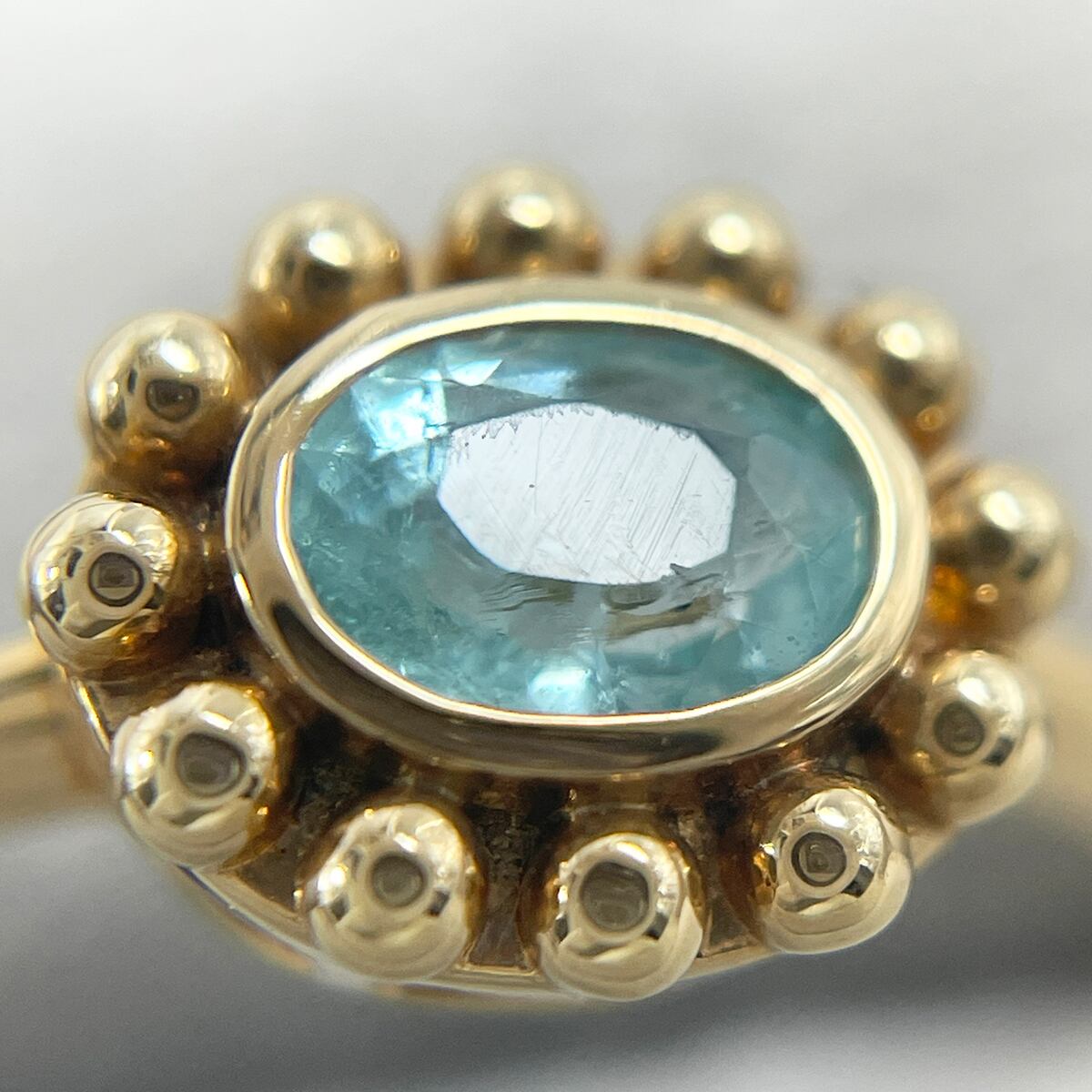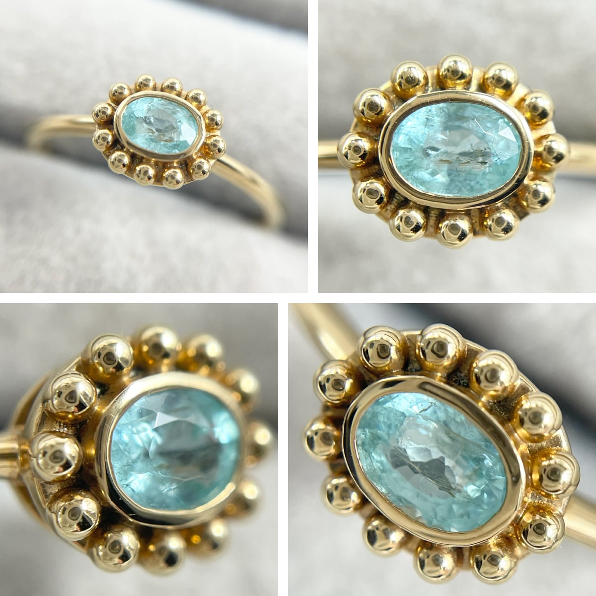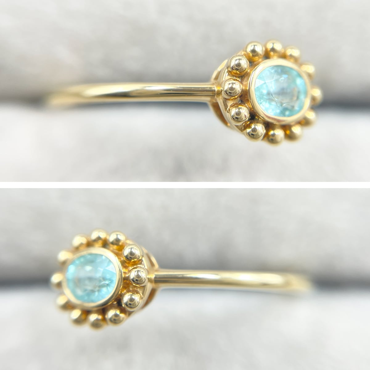 鮮やかなネオンブルーが目を惹くパライバトルマリンをゴールドのドットが縁取る、大人可愛いアンティーク調のデザイン♡
