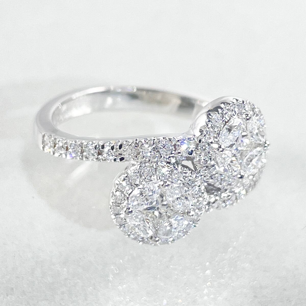 プリンセスカットとマーキスカット、2つの異なる輝きが共演するモダンなリング。