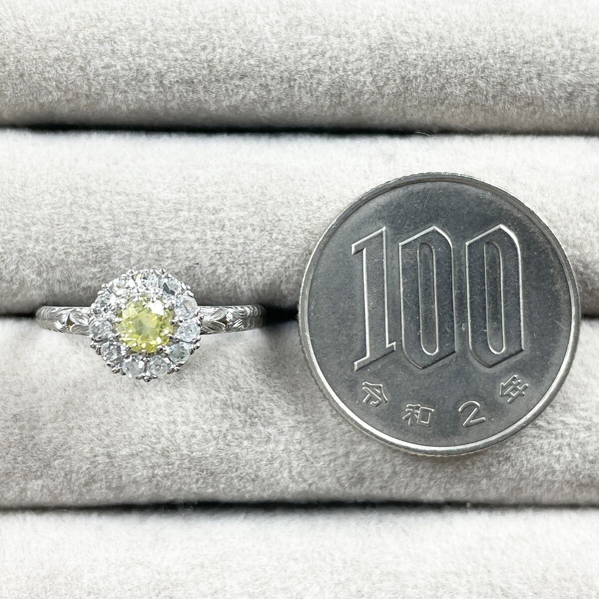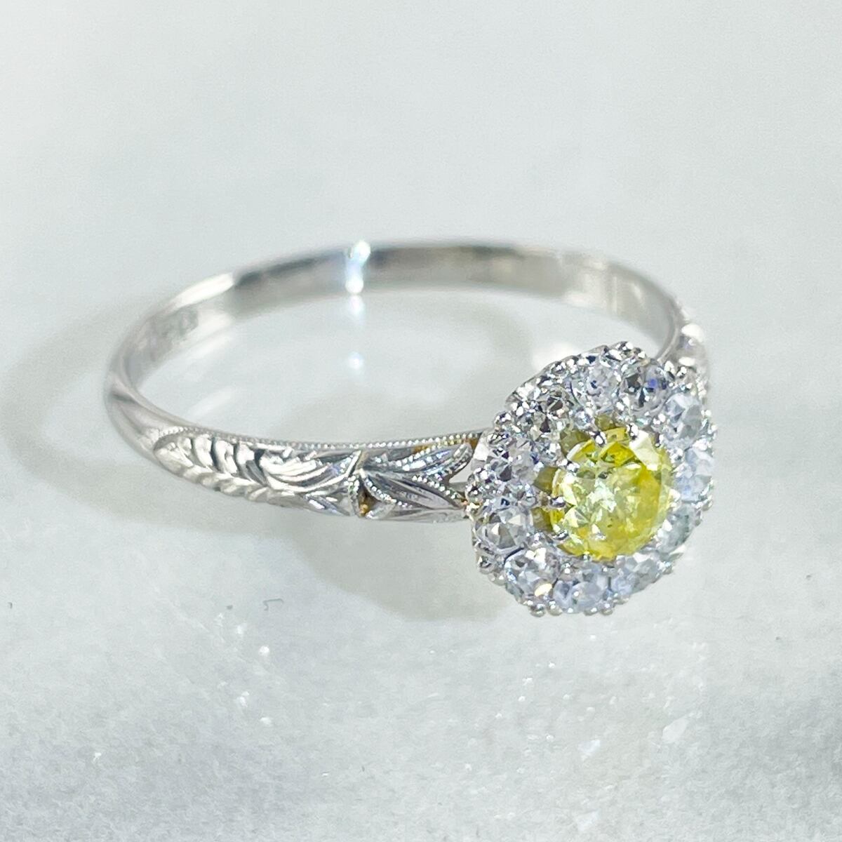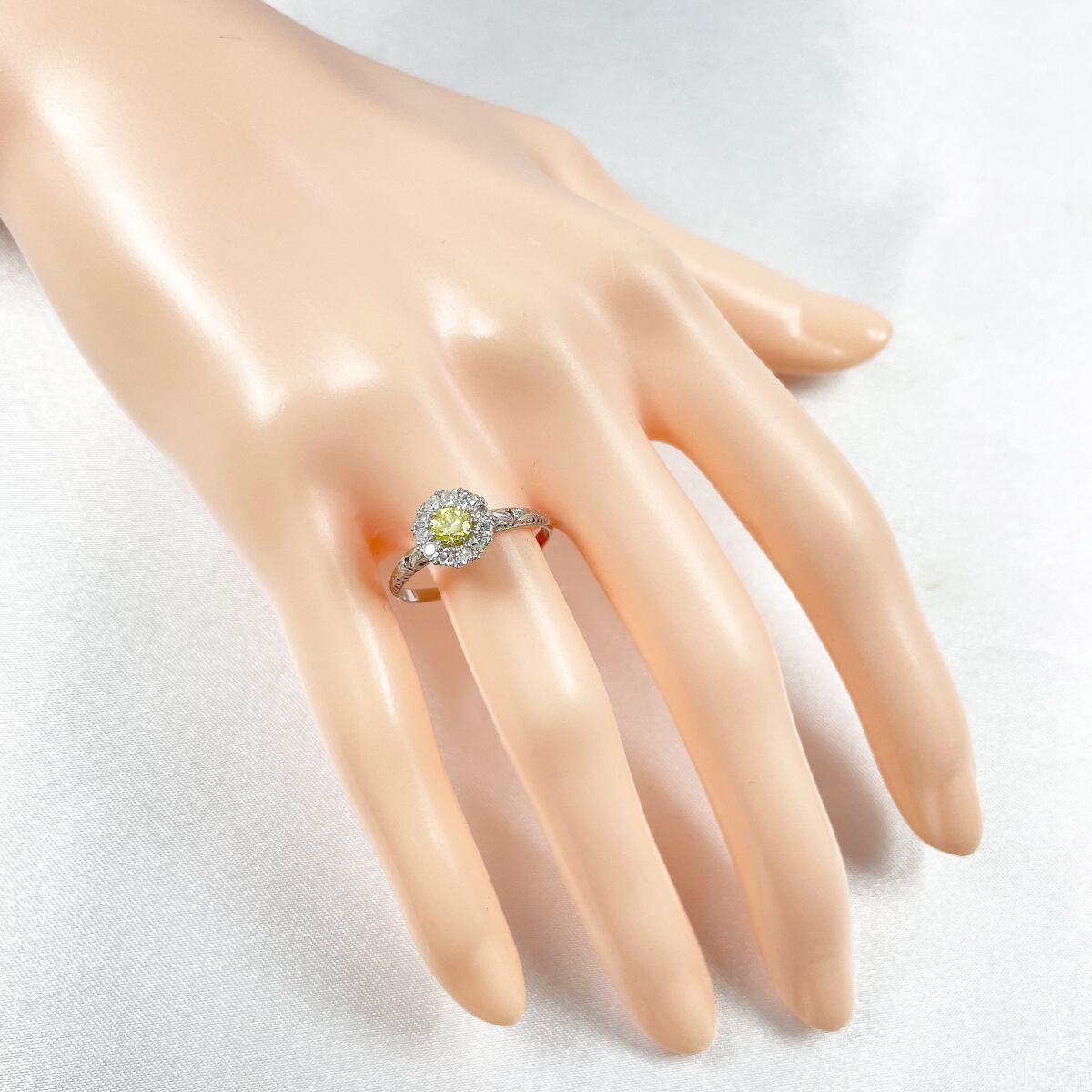 指先に太陽の光を纏うような、鮮やかなイエローダイヤモンドのリング。