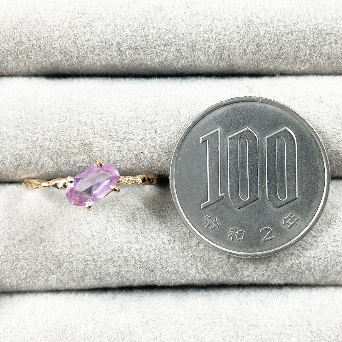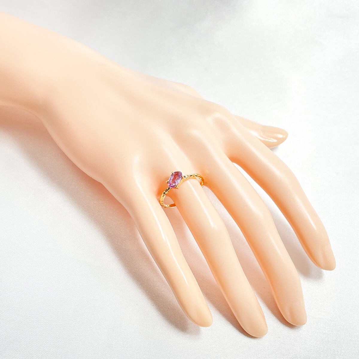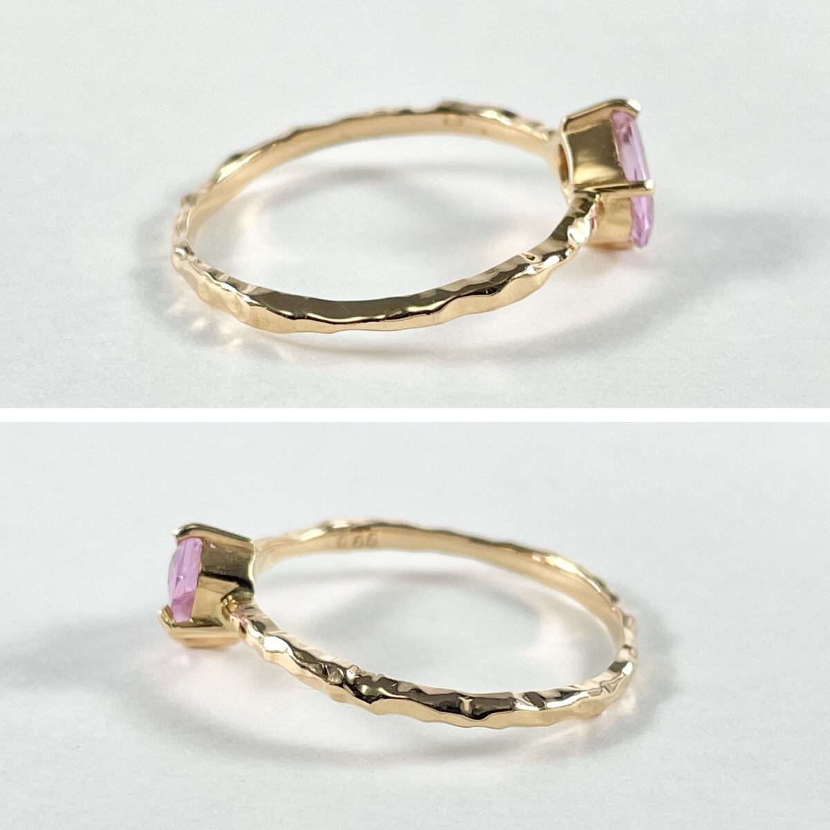 キャンディのようなピンクサファイアをあえて斜めにセッティングしたデザインがカジュアルな抜け感を演出♪