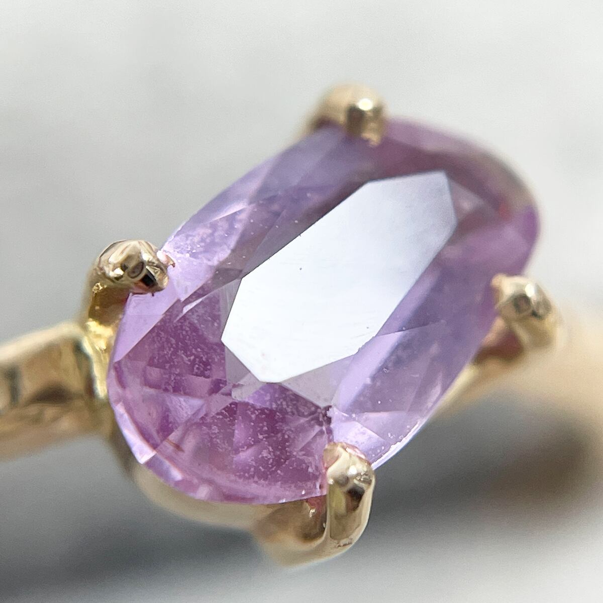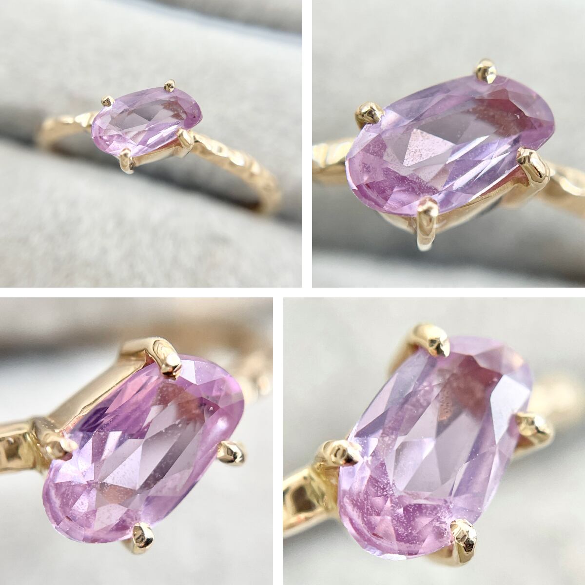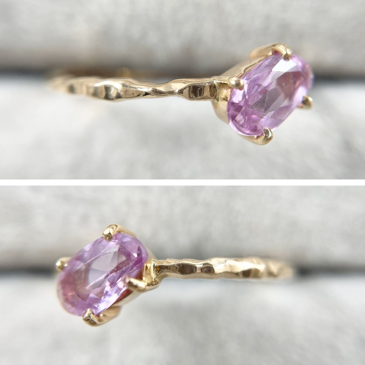 キャンディのようなピンクサファイアをあえて斜めにセッティングしたデザインがカジュアルな抜け感を演出♪