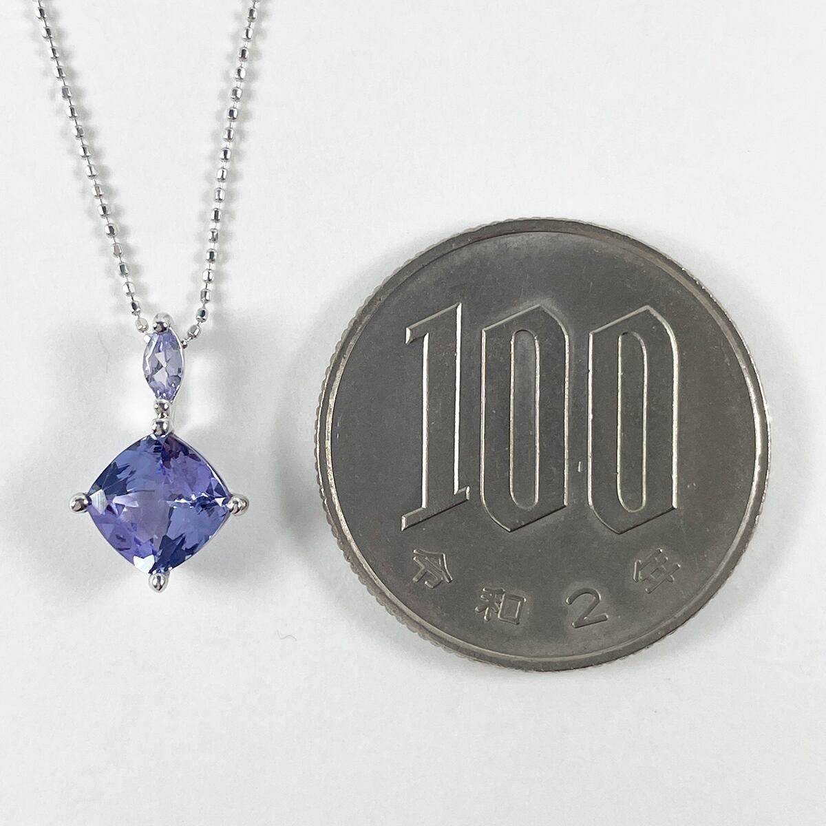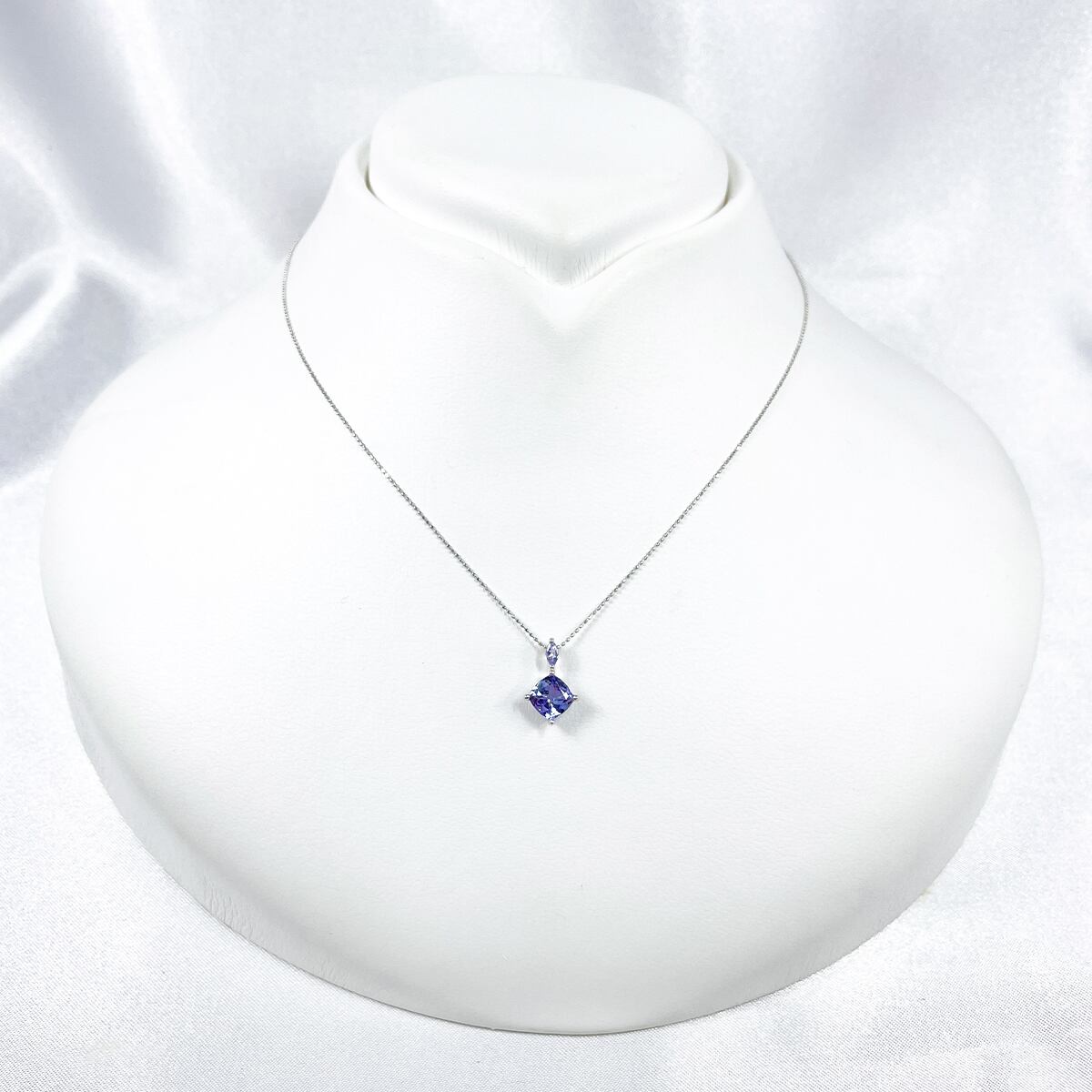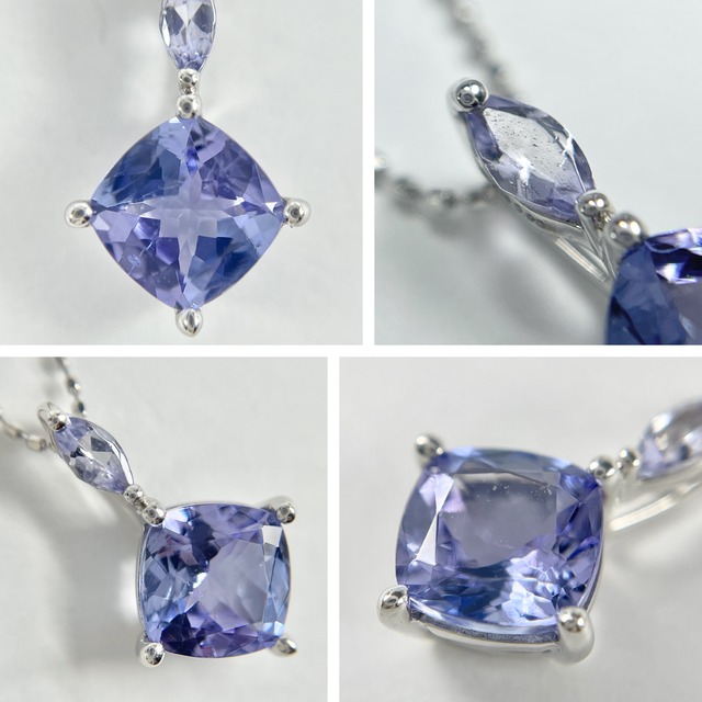 マーキスカットとクッションカットの2石使いが印象的なタンザナイトネックレス。
