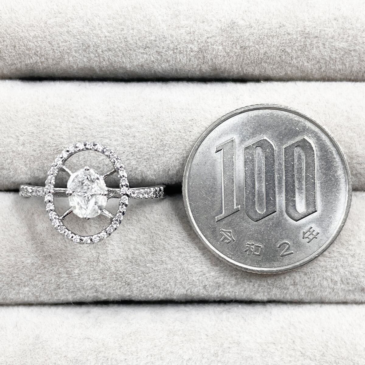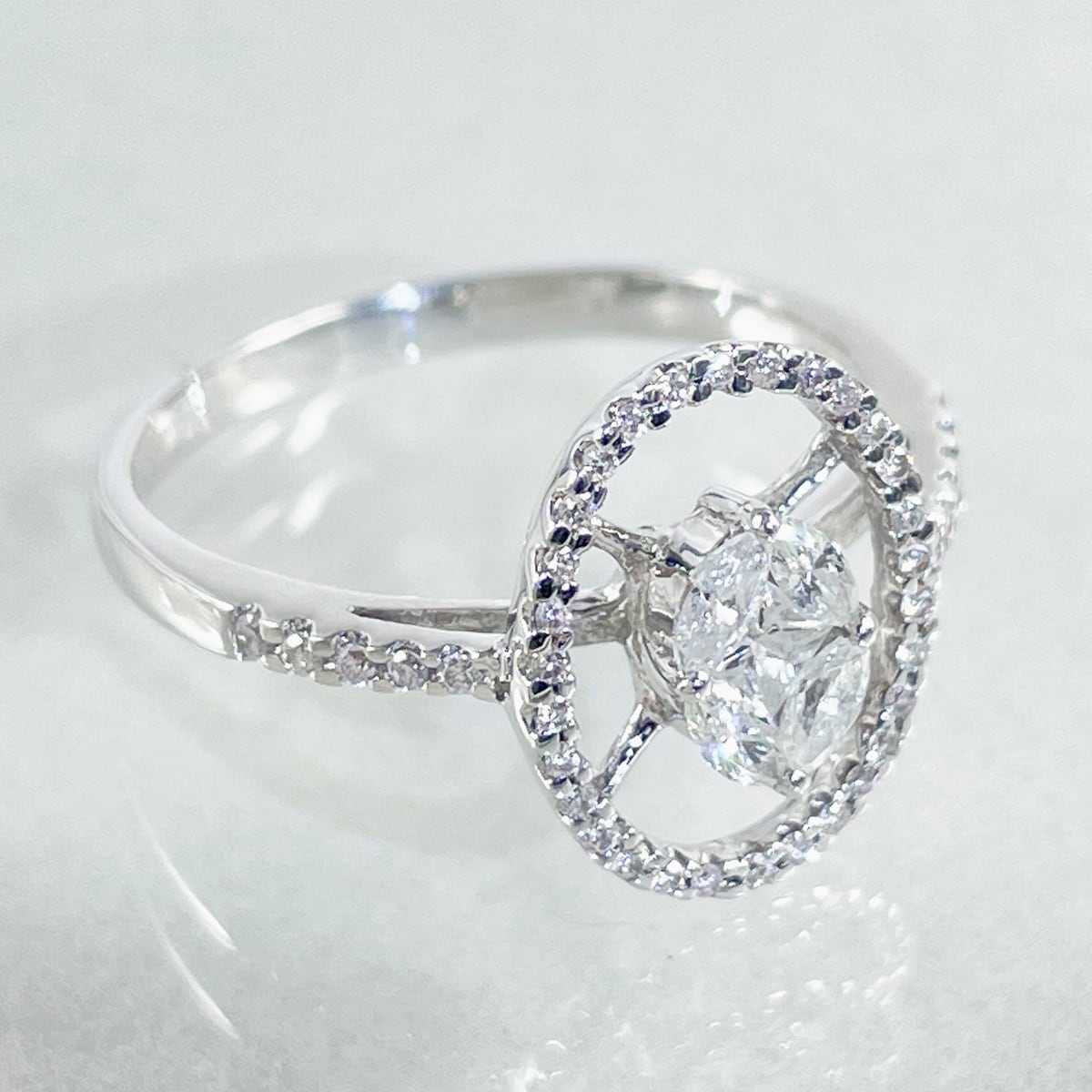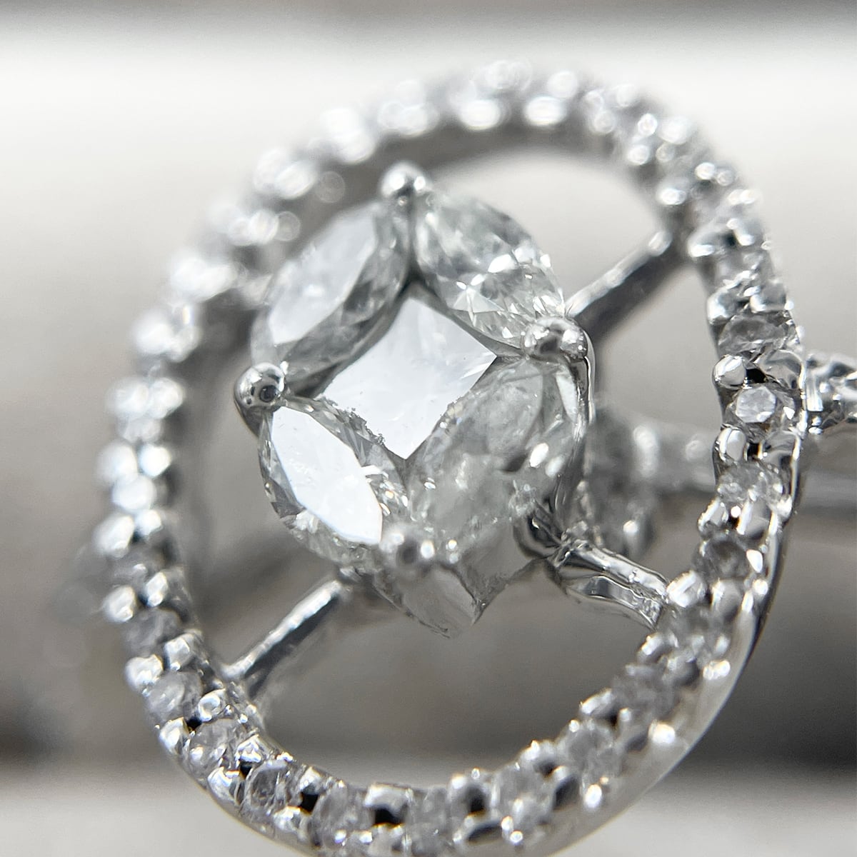 プリンセスカットを囲うように配置されたマーキスカット、宙に浮いたようなメレダイヤのサークルが独創的なデザインのリング。