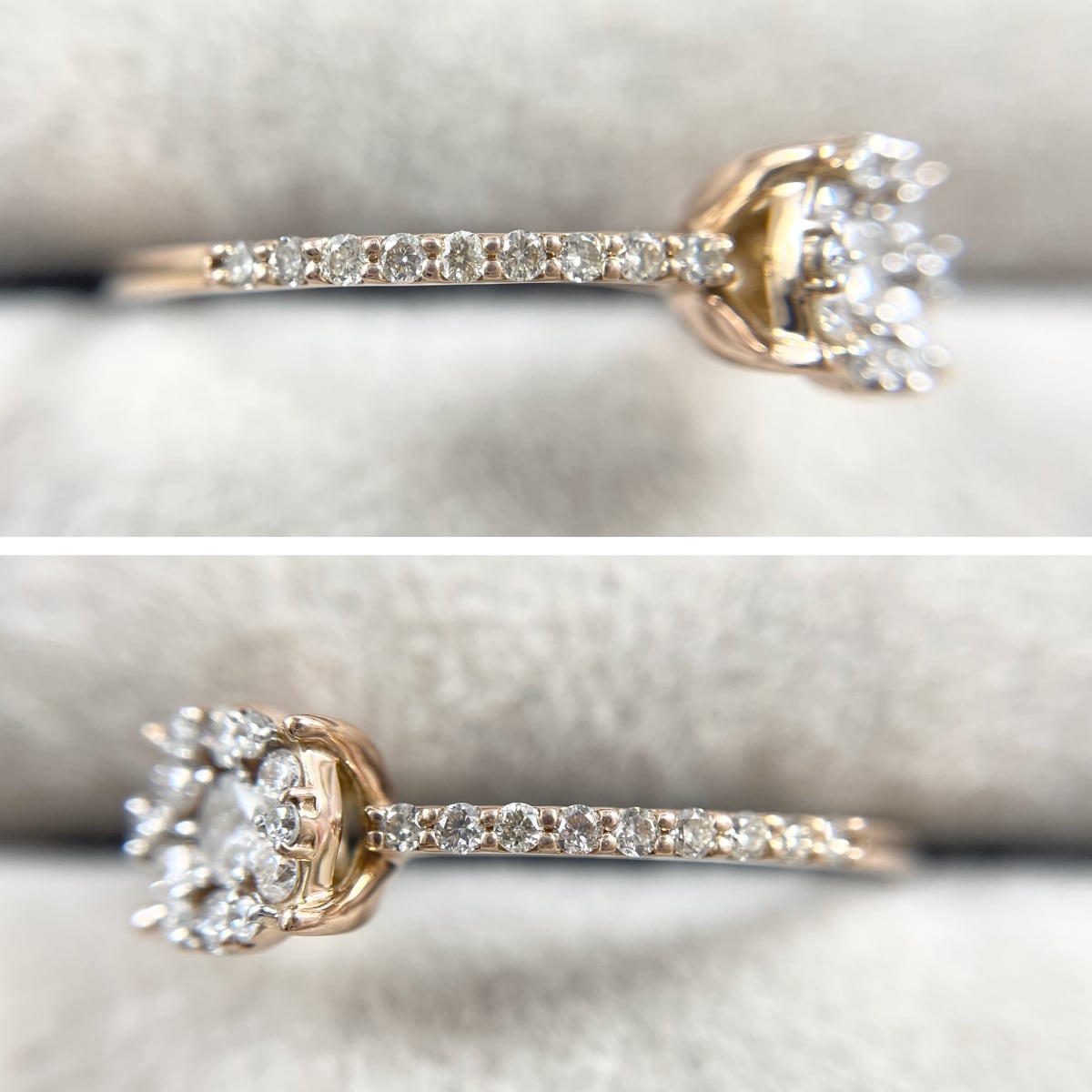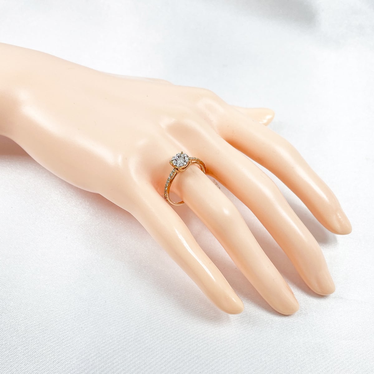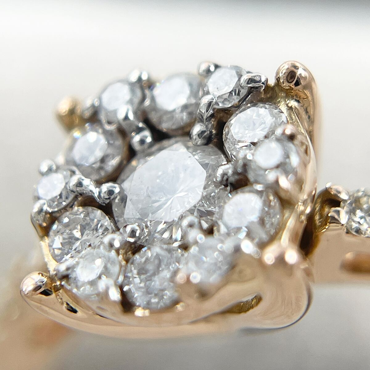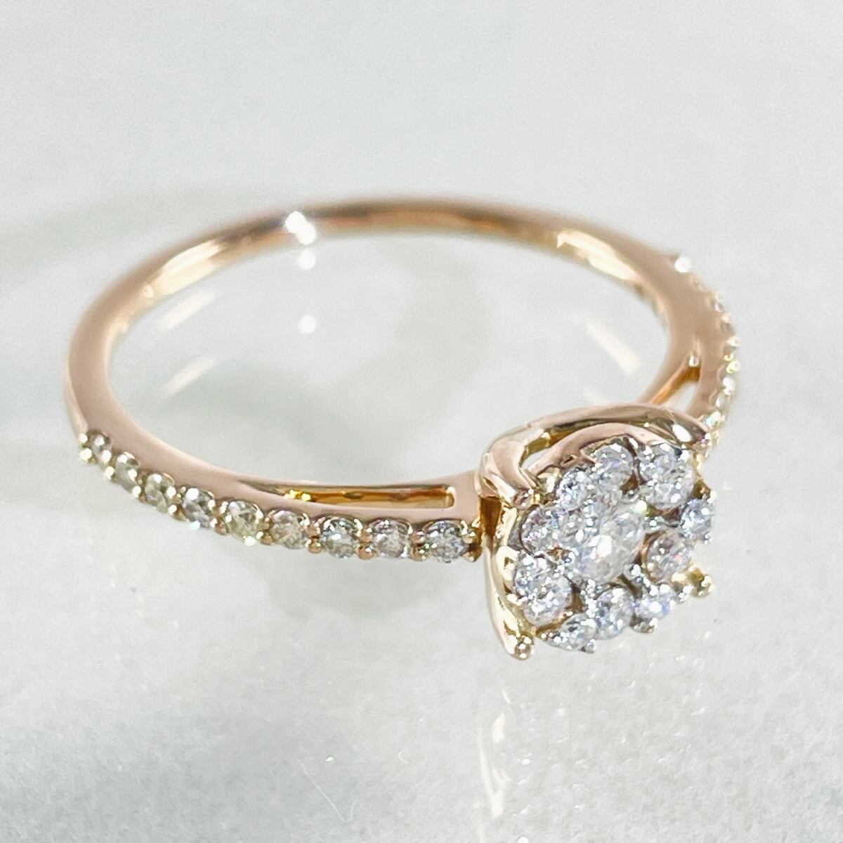 ピンクゴールドの優しい色味とセンターに向かって集まるダイヤモンドの輝きが上品なリング。