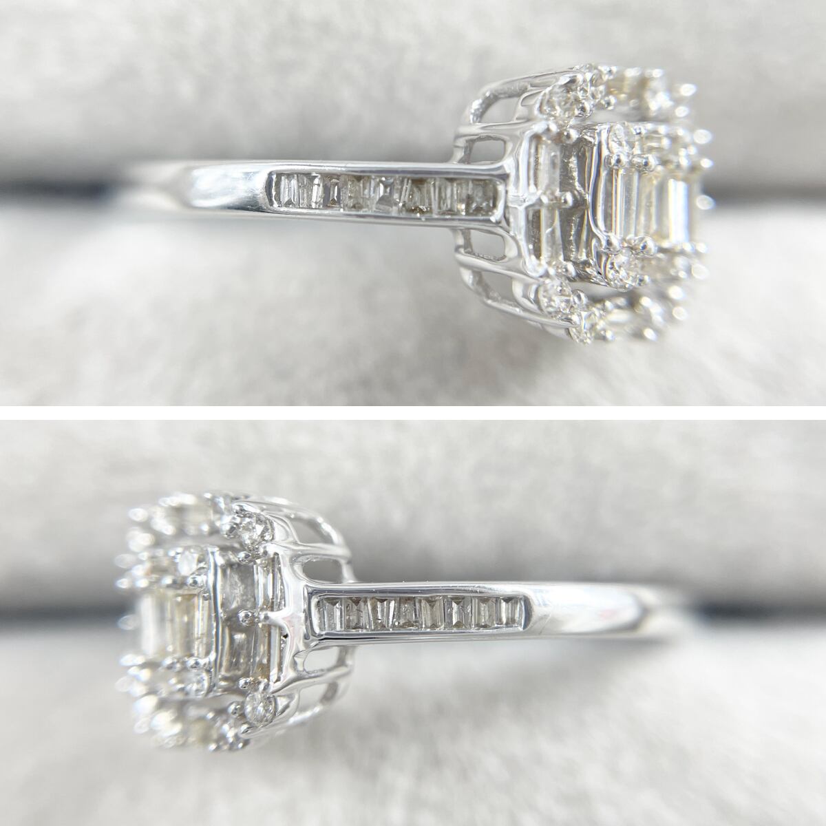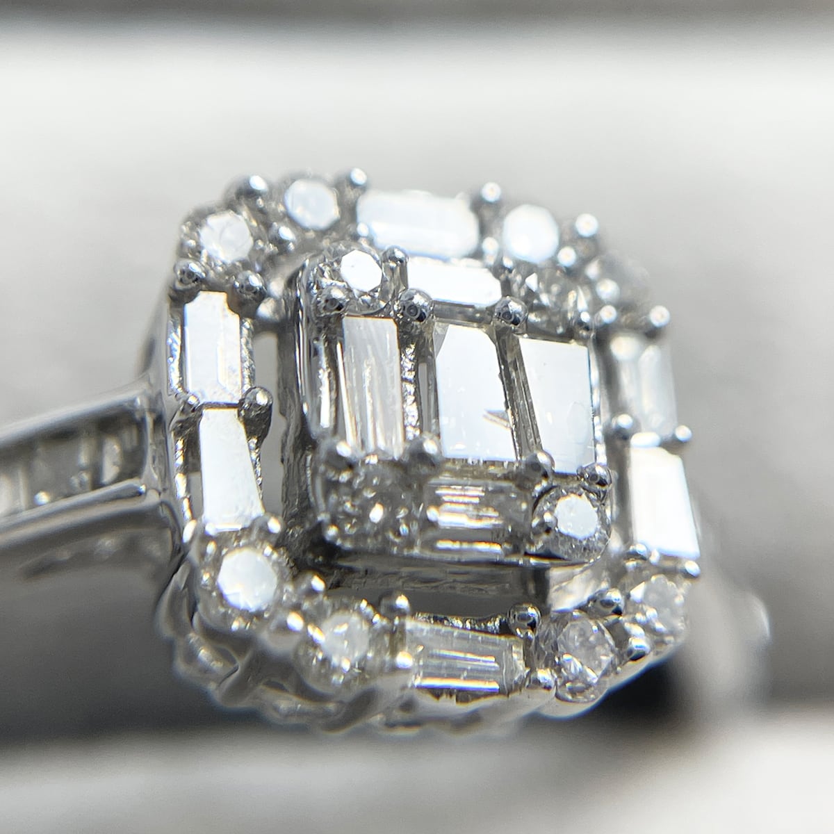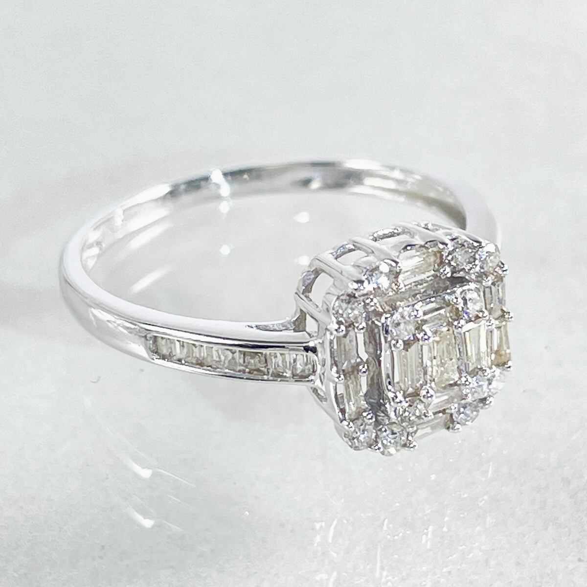 テーパーカットダイヤモンドを幾何学的に配した、芸術的なデザインのリング。