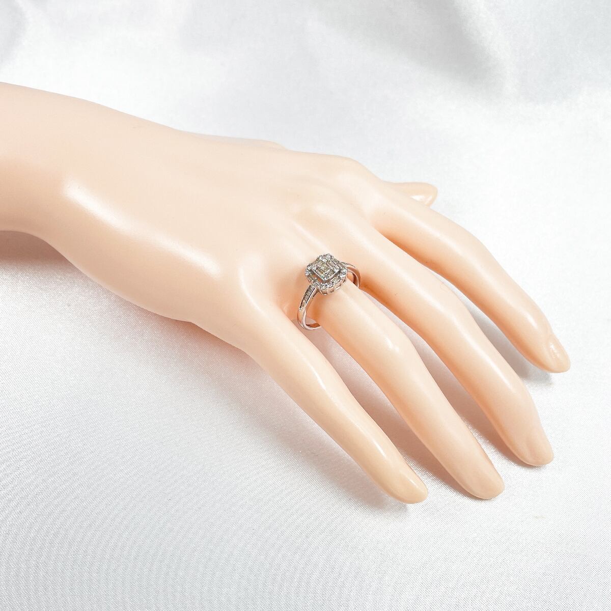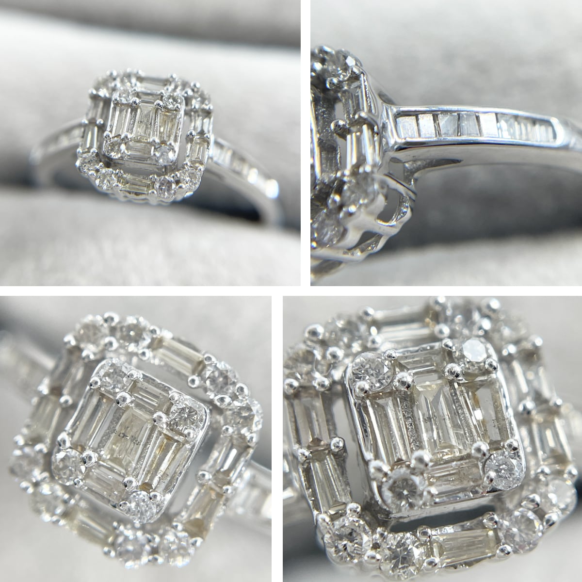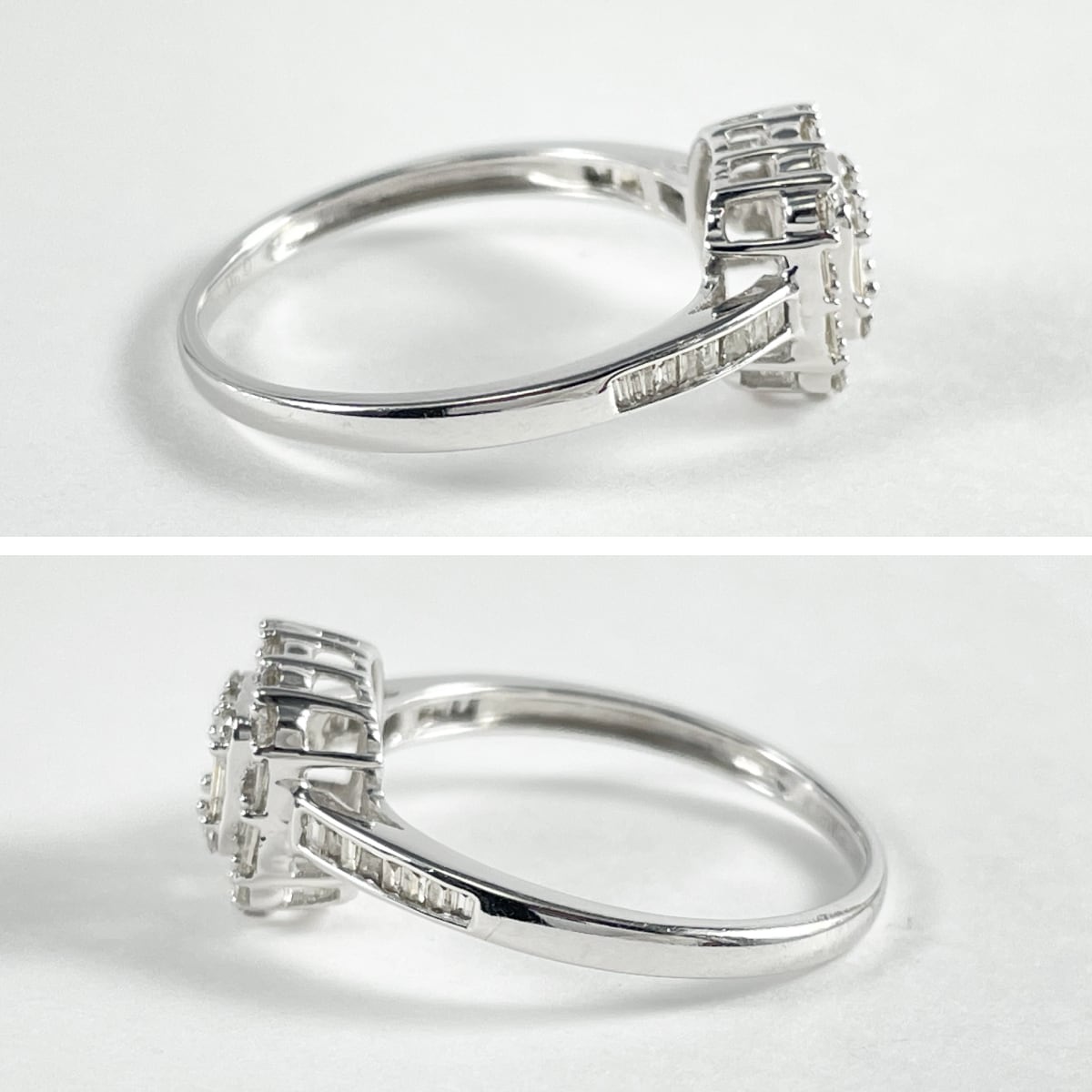 テーパーカットダイヤモンドを幾何学的に配した、芸術的なデザインのリング。