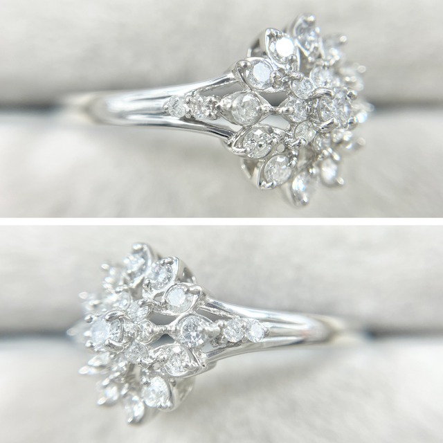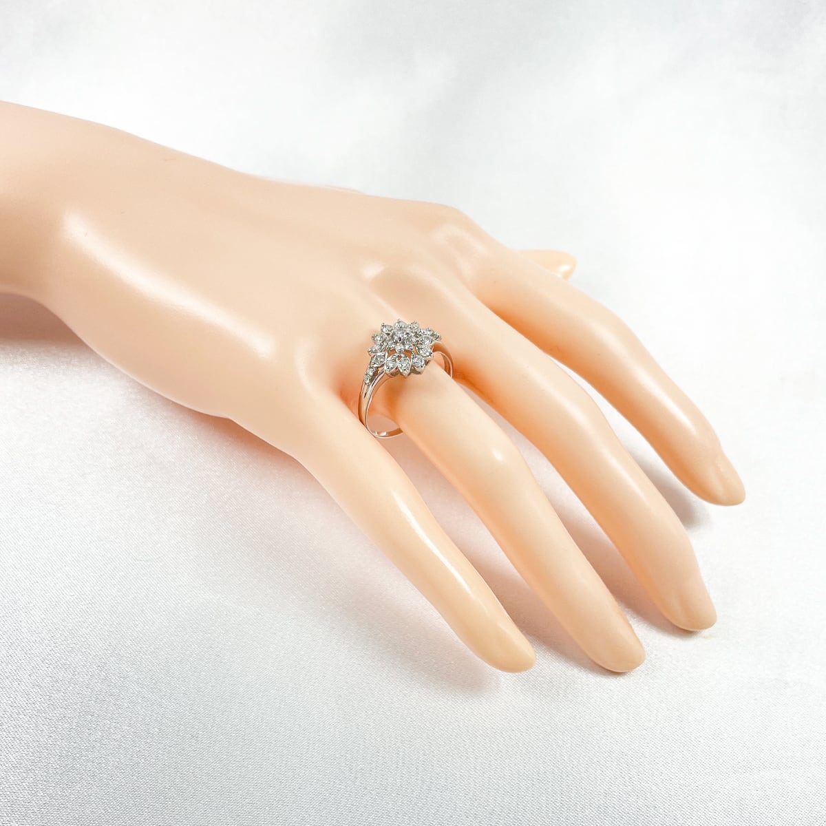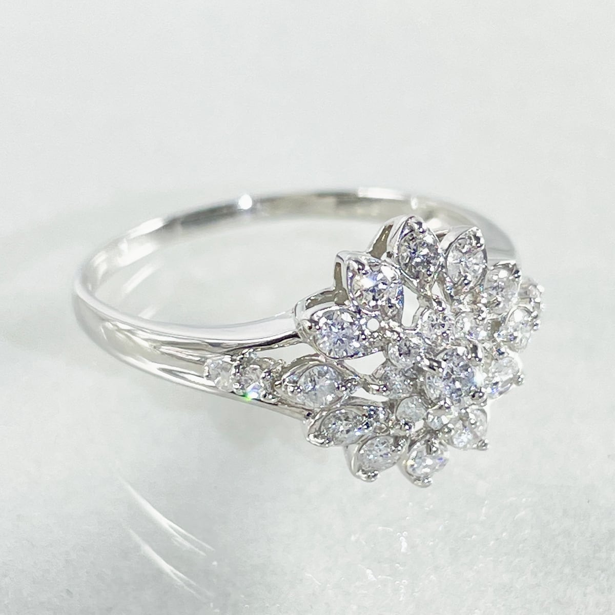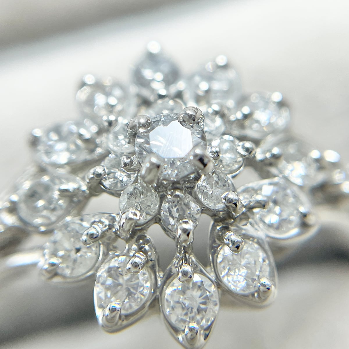 指先に咲き誇る光の花が美しい、ダイヤモンドのリング。