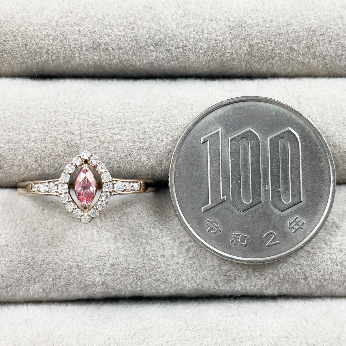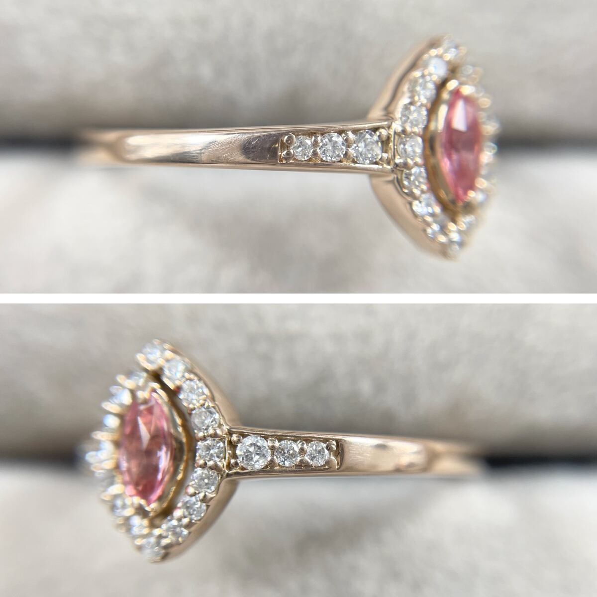 マーキスカットのピンクサファイアを、ダイヤモンドの光の輪で包み込んだリング。