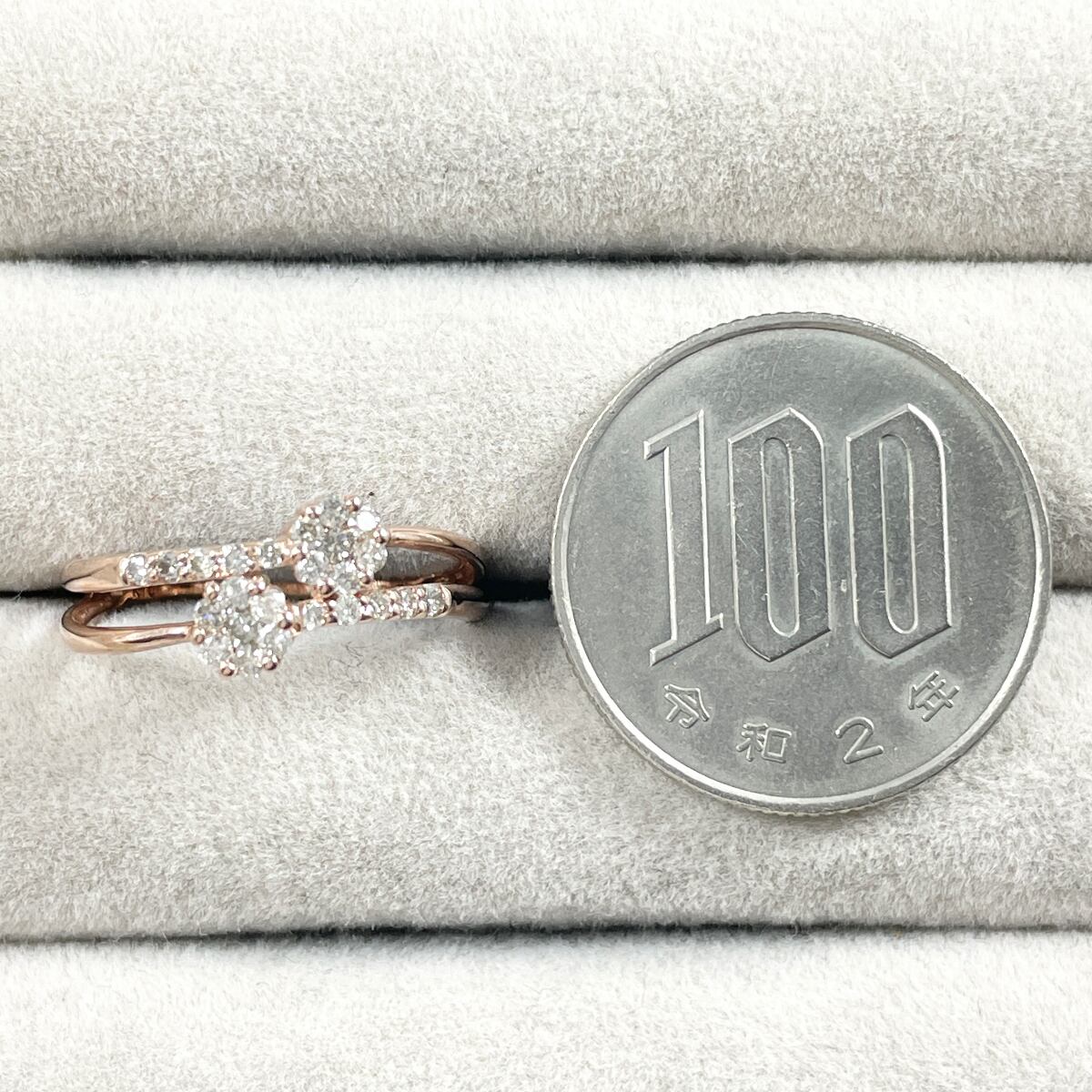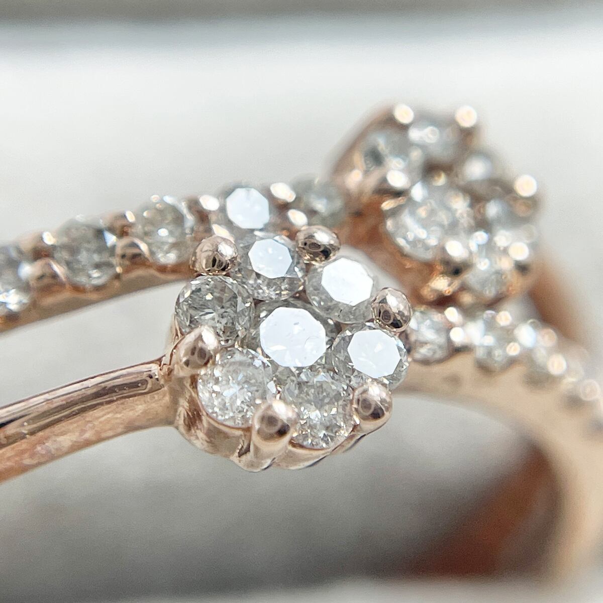 繊細なK10ピンクゴールドのアームとダイヤモンドのバランスが洗練された印象を与えるリング。