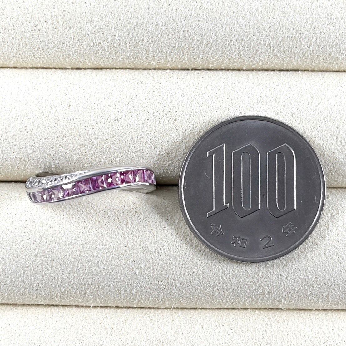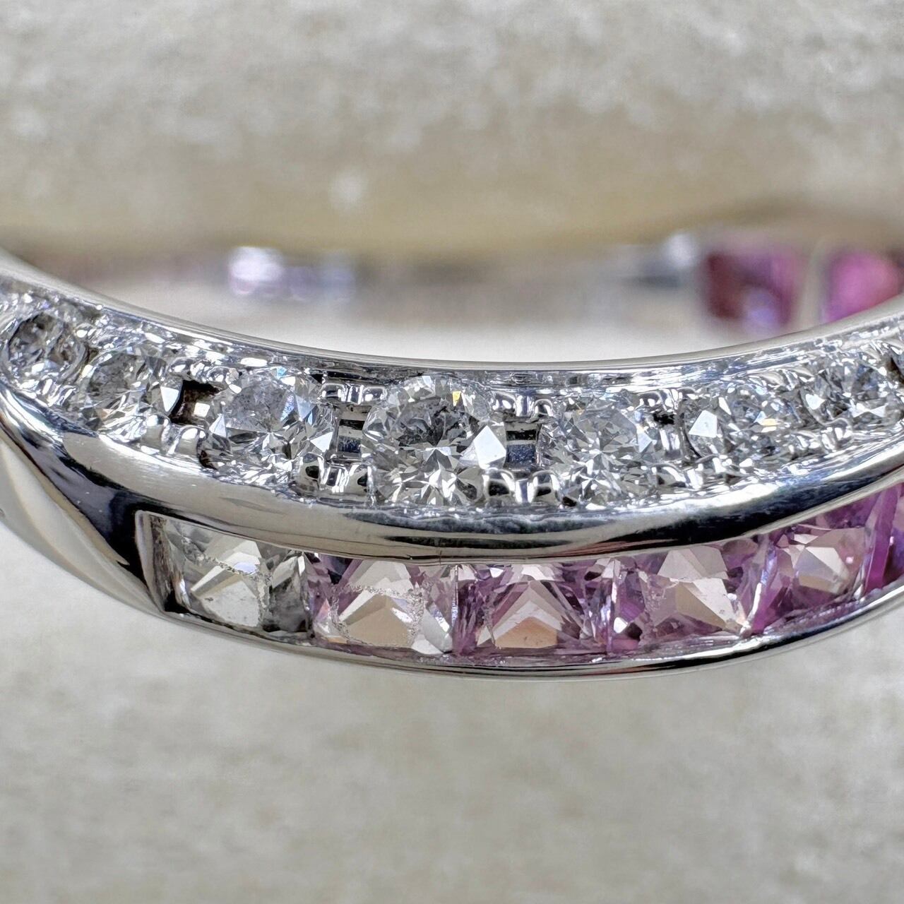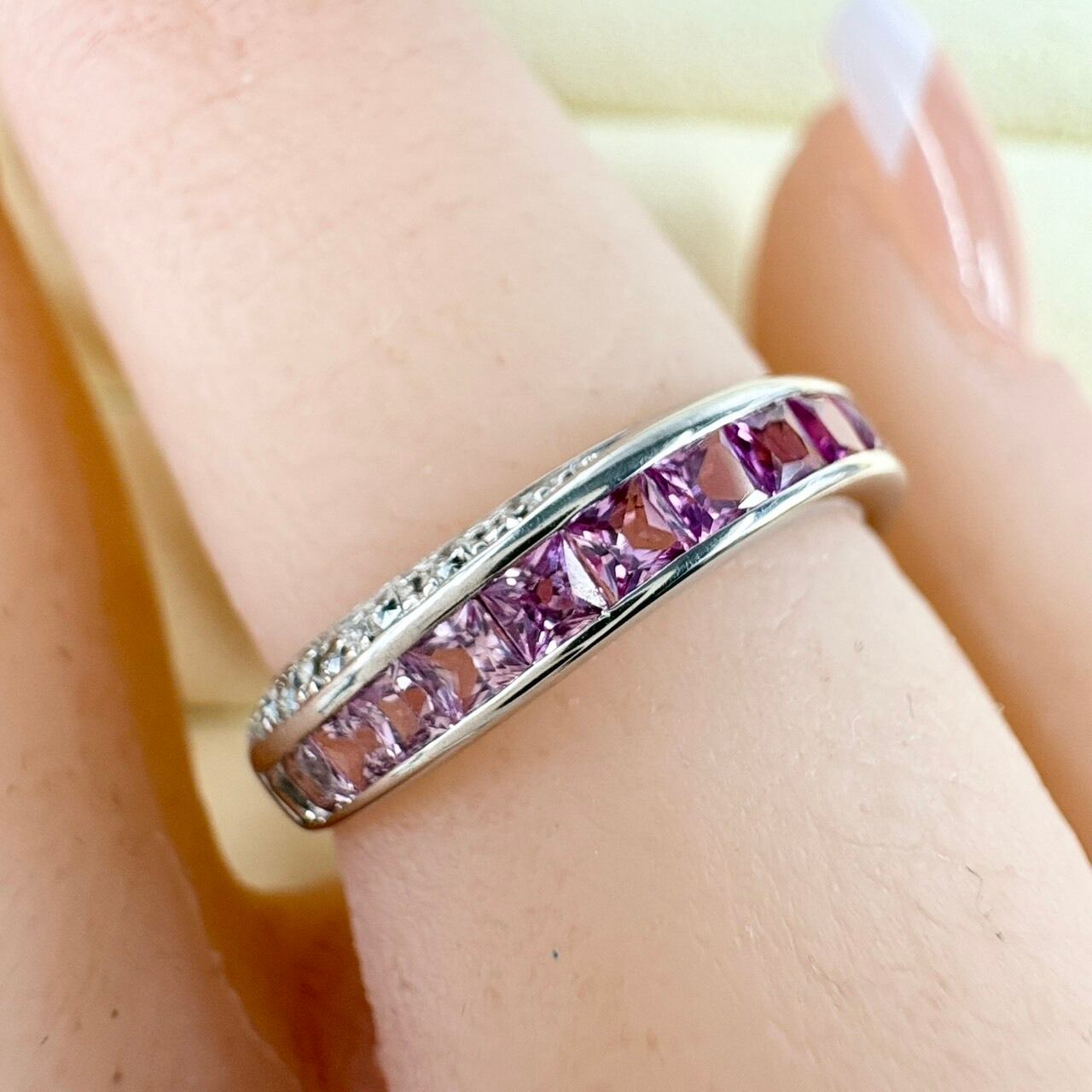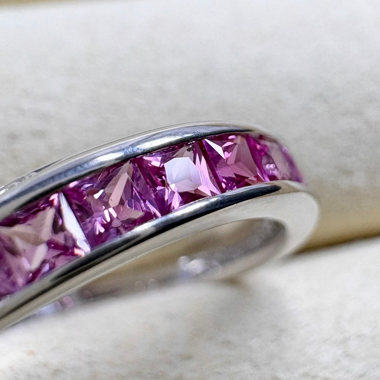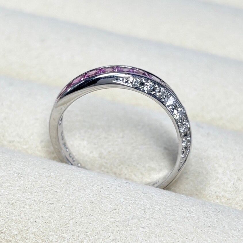 流れるようなピンクのグラデーションが美しい、プリンセスカットサファイアのリング。