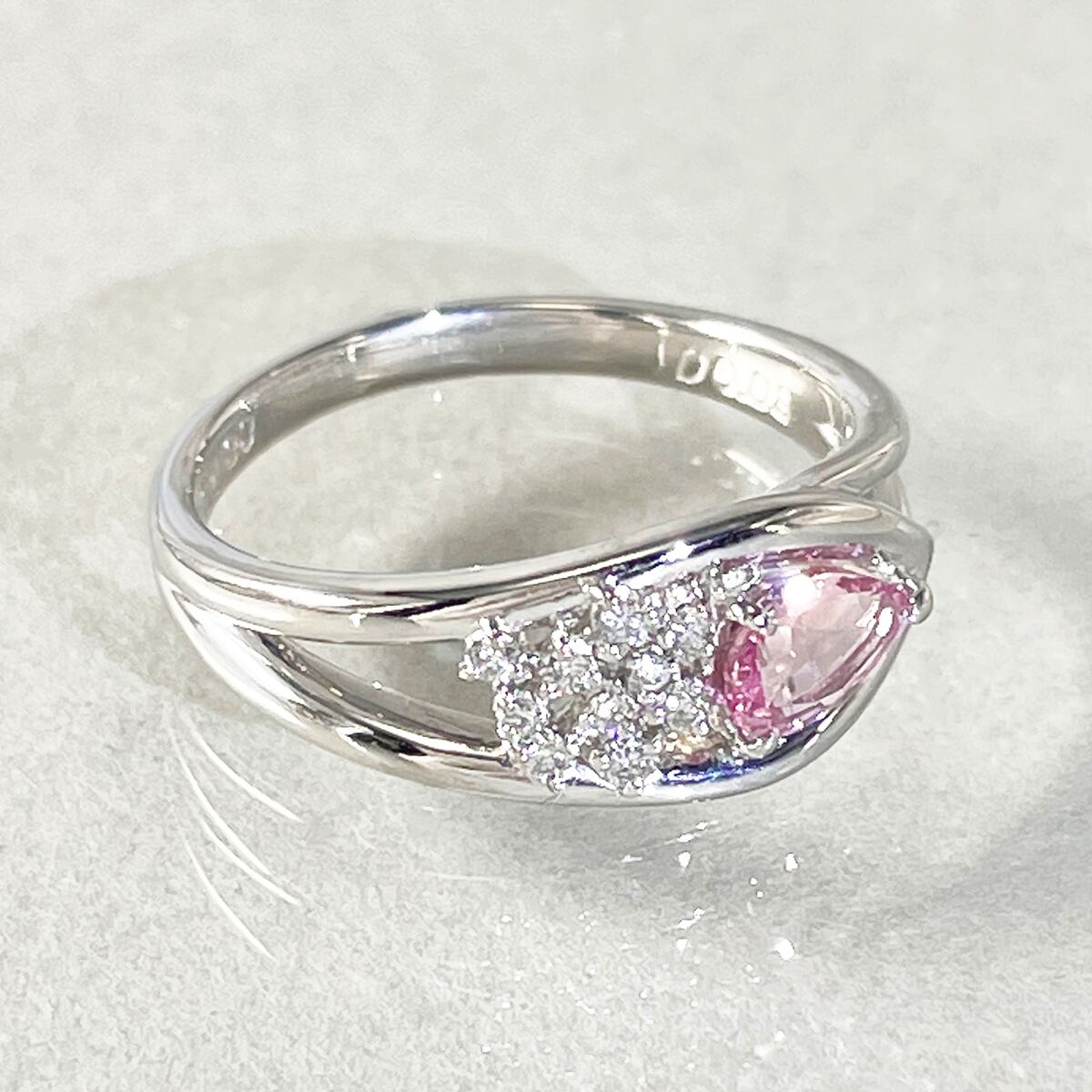 ペアーシェイプドカットのピンクサファイアを使用したリング。