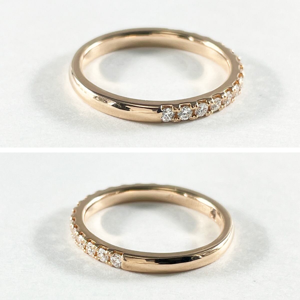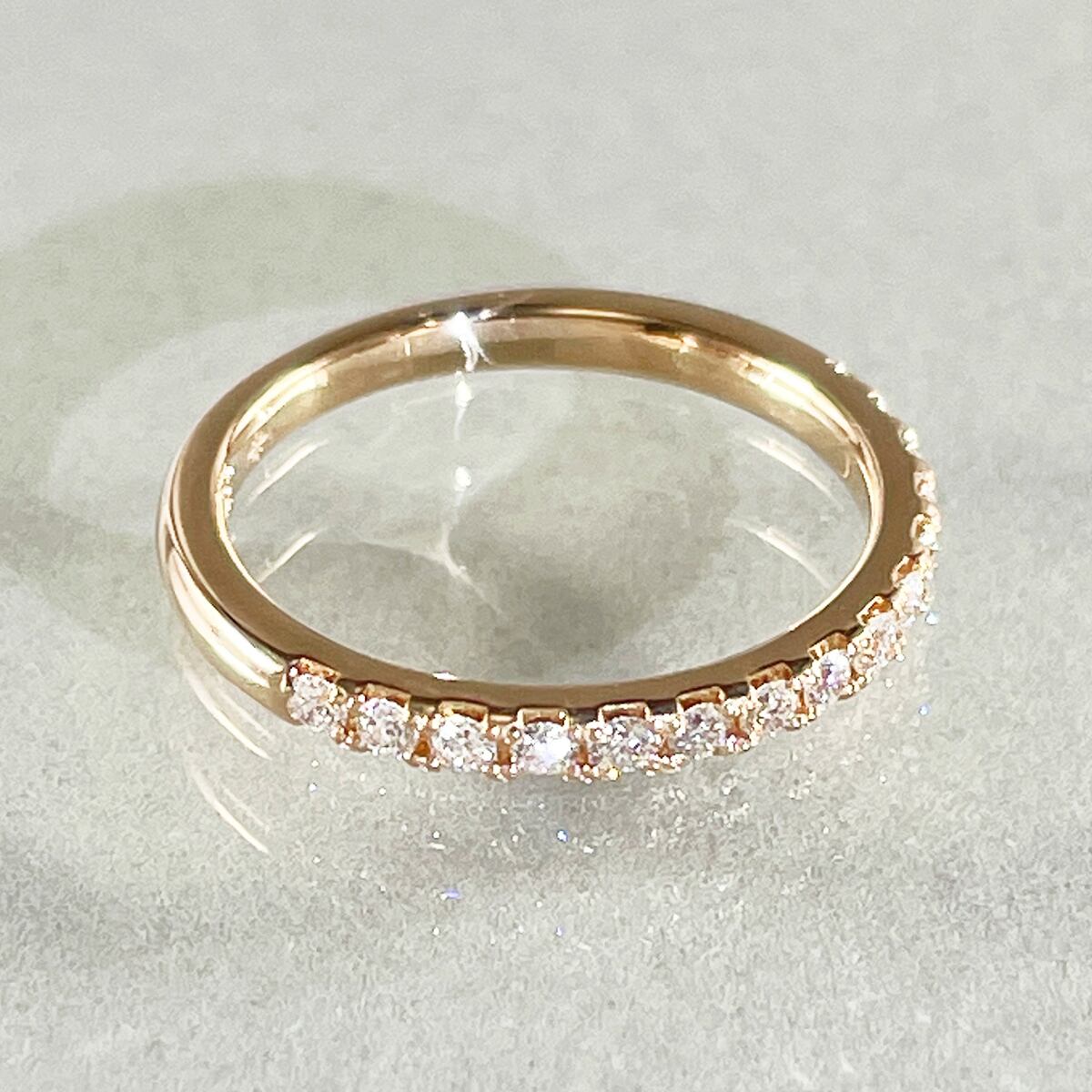 ピンクゴールドの丸みを帯びたシルエットが可愛らしい、ダイヤモンドのハーフエタニティリング。