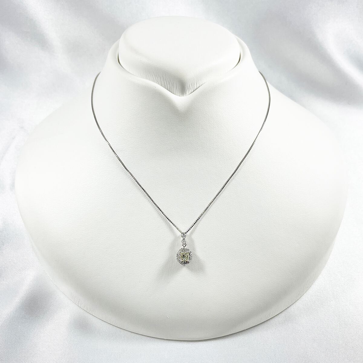 プリンセスカットのイエローダイヤモンドがセンターにセットされた取り巻きデザインのペンダント。