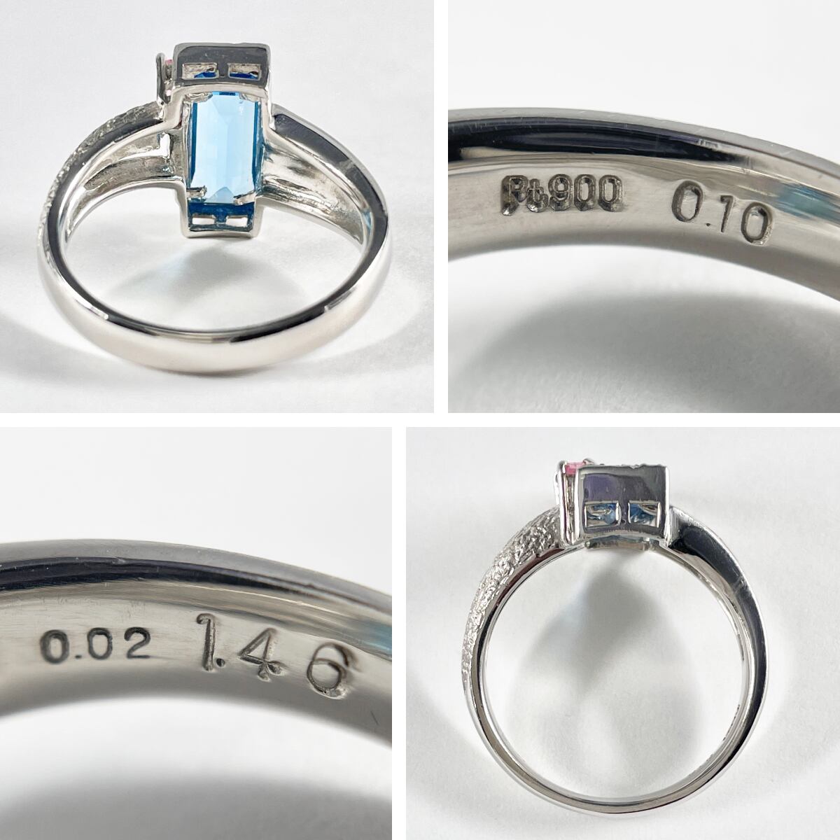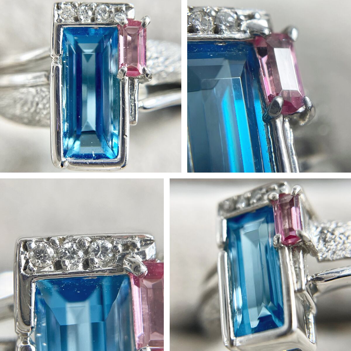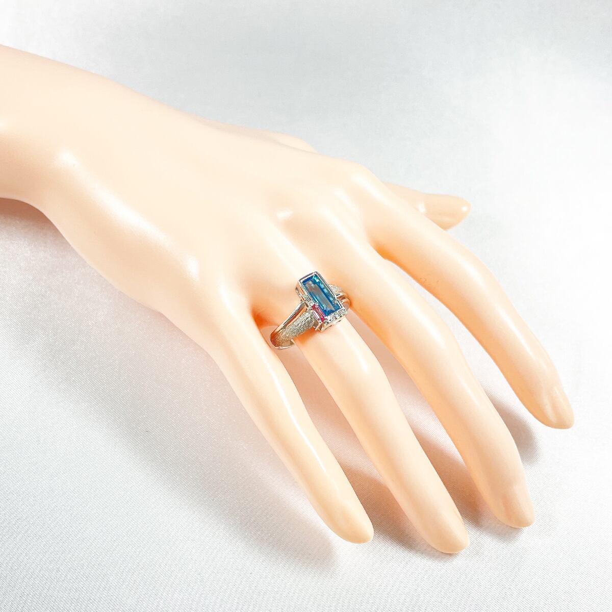 バゲットカットのブルートパーズとピンクトルマリンがセットされたデザインリング。