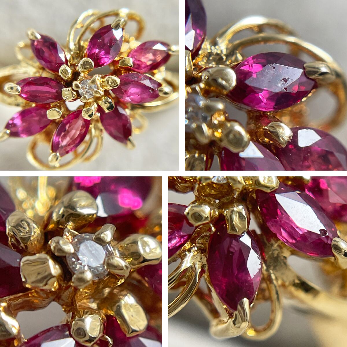 マーキスカットのルビーが使用された豪華なフラワーモチーフの指輪。