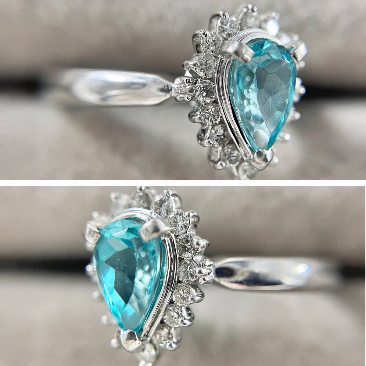 人目を惹きつける鮮やかなブルーカラーにペアーシェイプドカットのシルエットが美しいアイテムです。